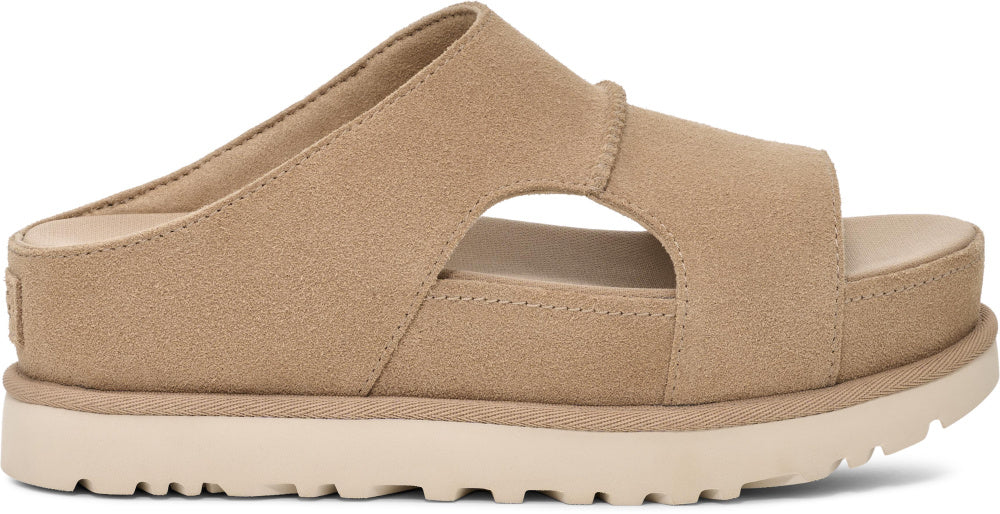 W Goldenstar Hi Cutout Side fra Ugg har plattformsåle og dekorative utskjæringsdetaljer på sidene som gir et luftig og stilrent uttrykk. Overdelen er laget i mykt semsket skinn, slip-on-funksjonalitet, med en solid plattformsåle får du ekstra høyde og gir god støtte og demping gjennom hele dagen. Sandalene har et mykt tekstilfôr med resirkulerte materialer og en komfortabel innleggssåle med luktreduserende behandling. Sandalen er normal i størrelsen, med en trendy, voluminøs silhuett som passer perfekt til sesongens antrekk.