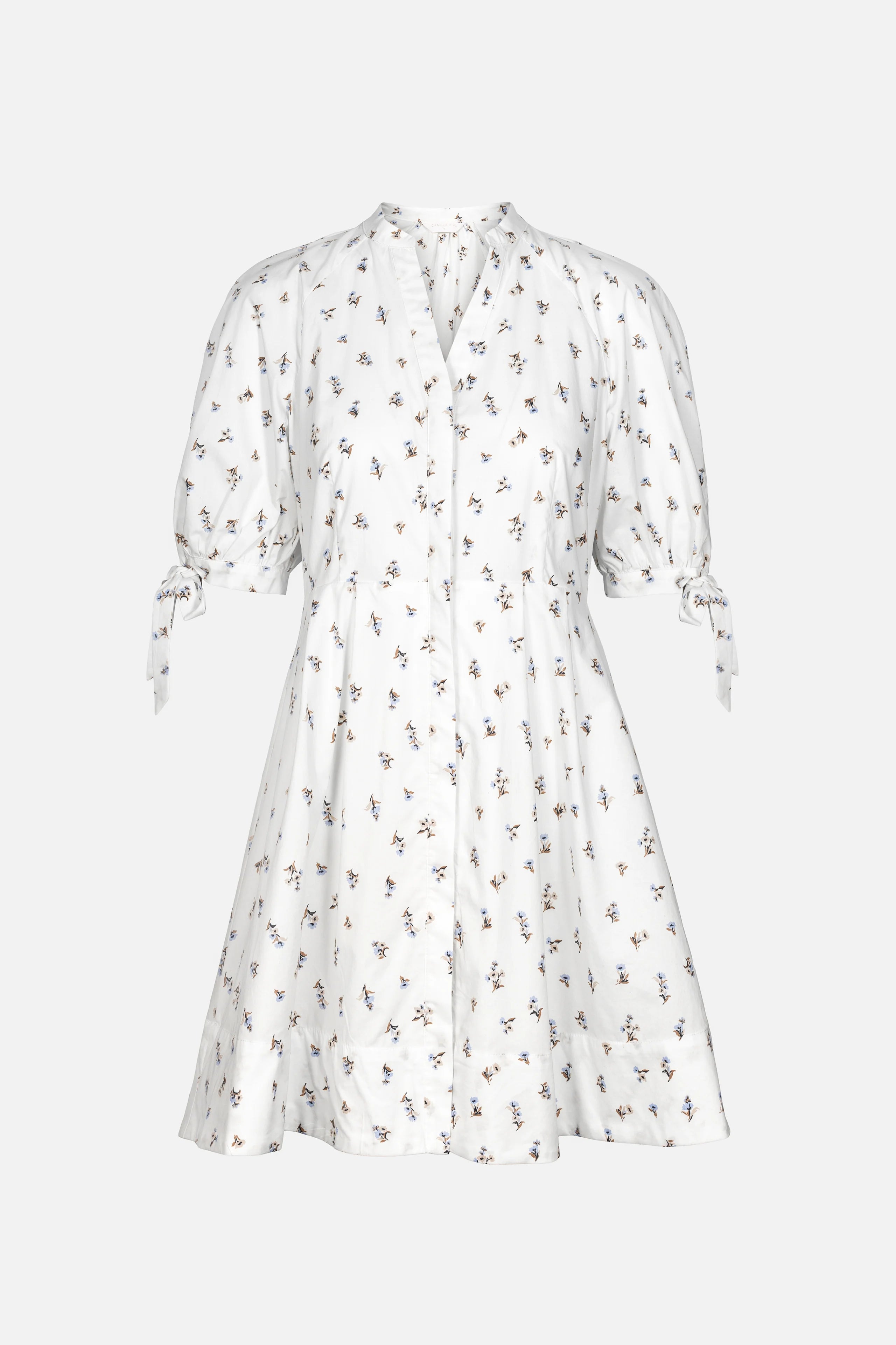 er laget av sprø bomullssateng og har puffermer med justerbare knytebånd og plisserte detaljer i midjen. Kjolen er kortskåret og har V-hals med skjult knappelukking foran for en raffinert finish.