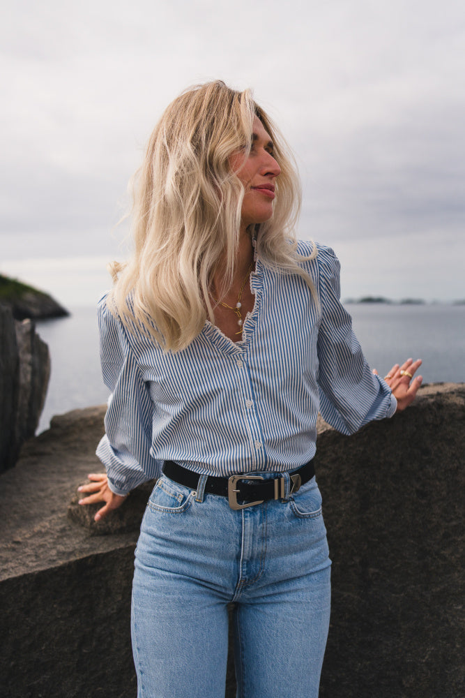 Ida Maja V Shirt fra Raus er den perfekte blusen i garderoben din. Skjorten har et klassisk og feminint uttrykk med smale blå striper og en flatterende V-hals med rysjekrage som gir et delikat preg. Blusen har lange ermer med mansjetter, knappelukking hele veien ned i front og en rett passform som gir et tidløst uttrykk. Laget i 100% bomull som er lett og mykt og føles behagelig mot huden og er normal i størrelsen.