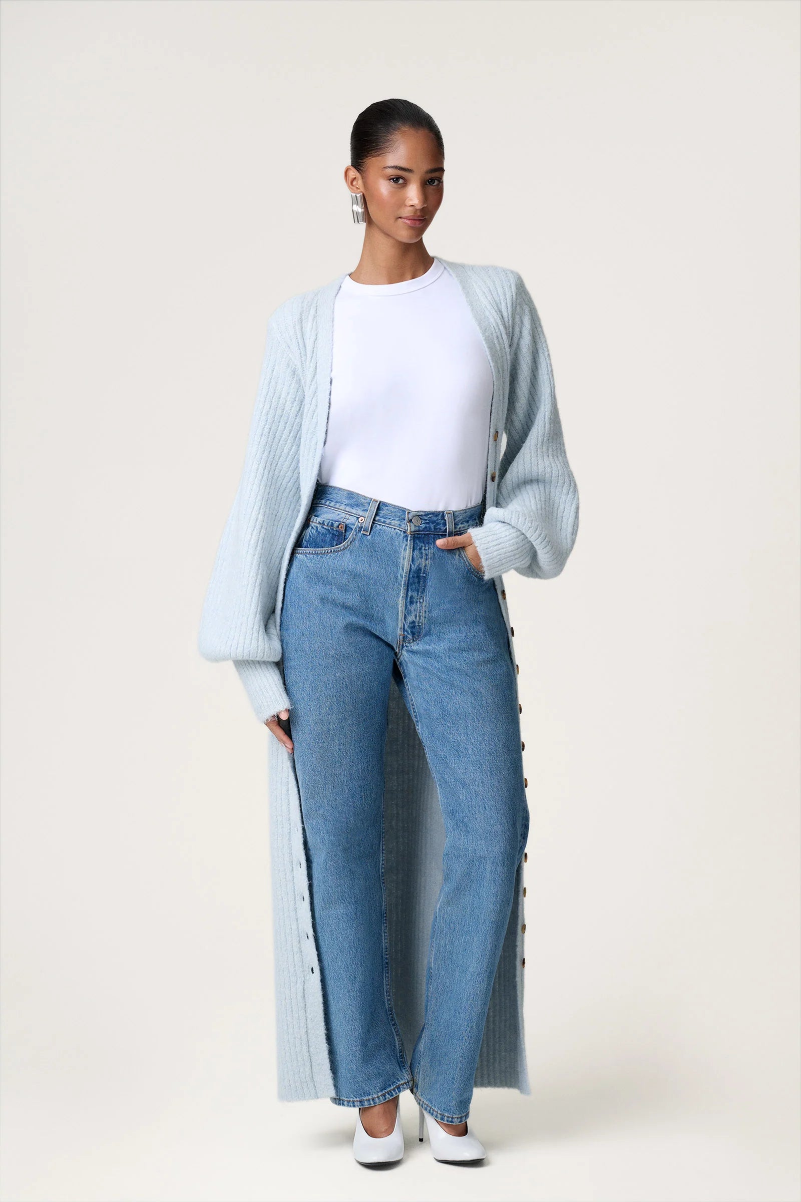 Montana Dress Light Blue Melange fra Adoore er en figurnær kjole i mykt strikket materiale. Den har knappelukking foran, V-hals med krage og lange ballongermer med markerte mansjetter. Stoffet er tynt, men har en viss tyngde som kan gjøre at kjolen strekker seg litt over tid og blir noe lengre.