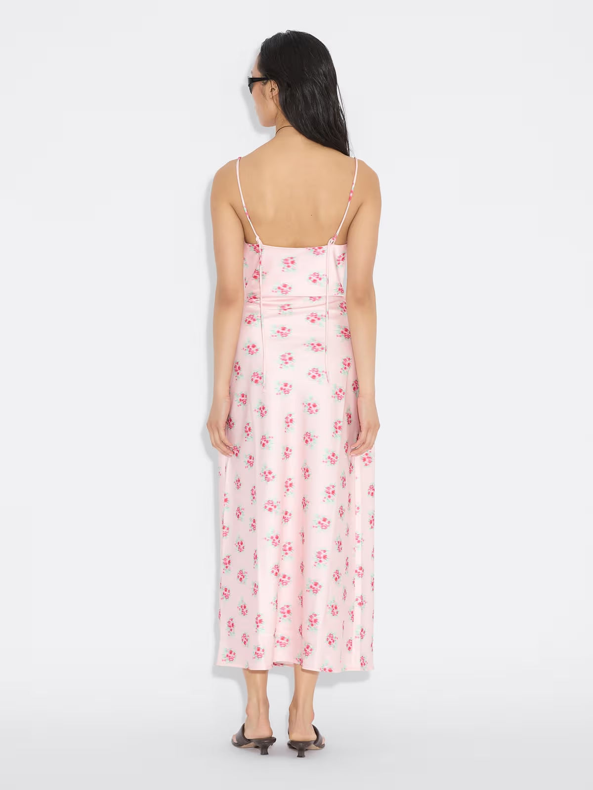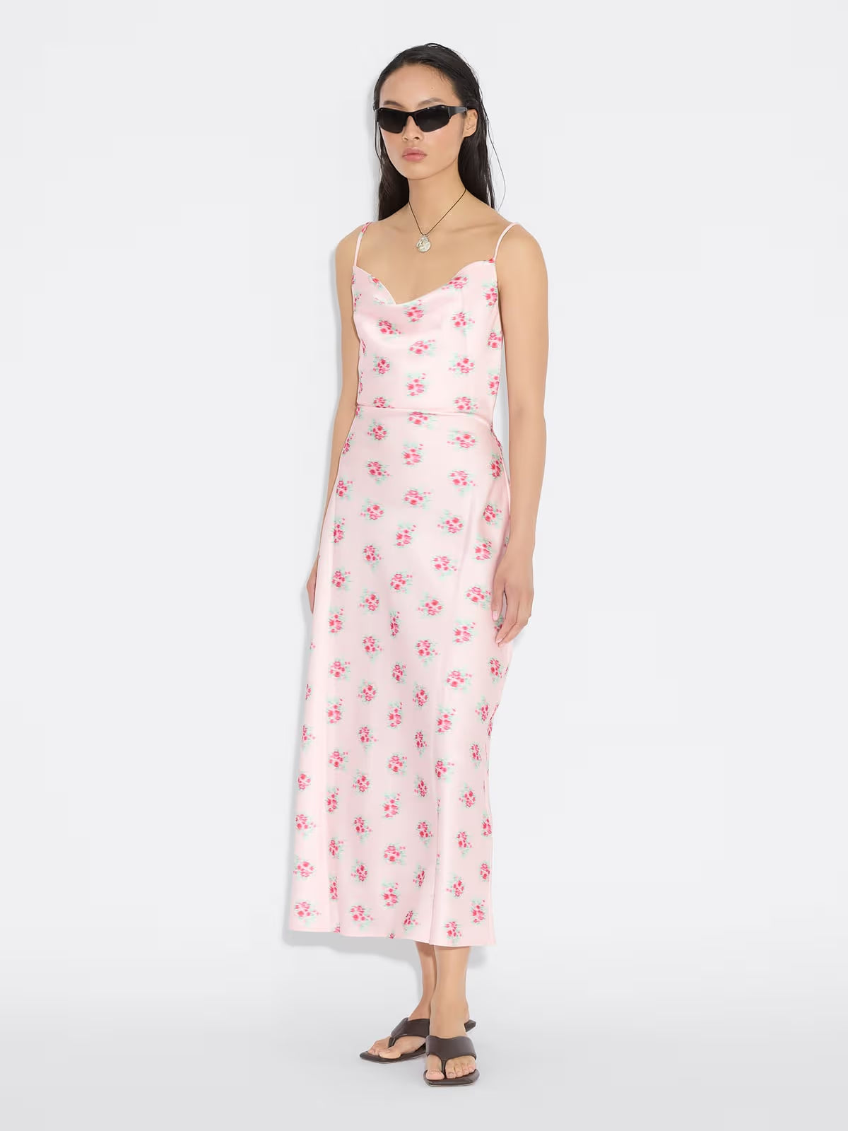 stroppekjolen som kombinerer en feminin silhuett med et moderne og sofistikert uttrykk, perfekt for både hverdag og sommerlige anledninger. Kjolen har en flatterende slim fit-passform med et elegant skråsnitt som gir et mykt og naturlig fall langs kroppen. Den midtlange lengden skaper en balansert og stilren look, mens vannfallsdraperingen foran i halsen tilfører et eksklusivt og delikat preg. De justerbare spaghettistroppene gjør det enkelt å tilpasse passformen etter eget ønske. Laget i resirkulert polyester, kombinerer kjolen stil med et mer bærekraftig valg. Det sesongbaserte printet gir et friskt og trendy uttrykk som gjør kjolen til et blikkfang i garderoben. En perfekt kjole for deg som ønsker en elegant, lett og moderne stil.