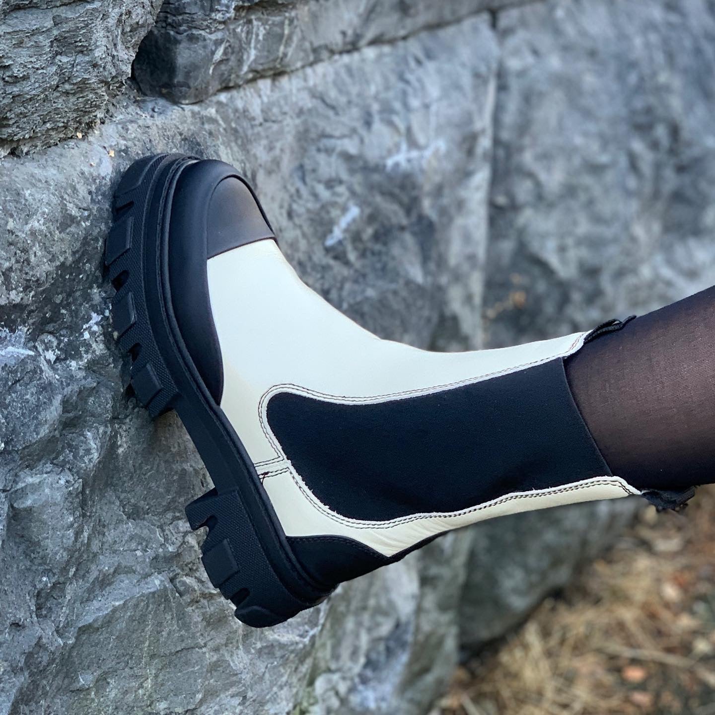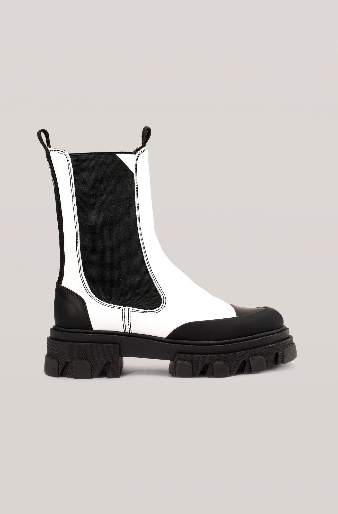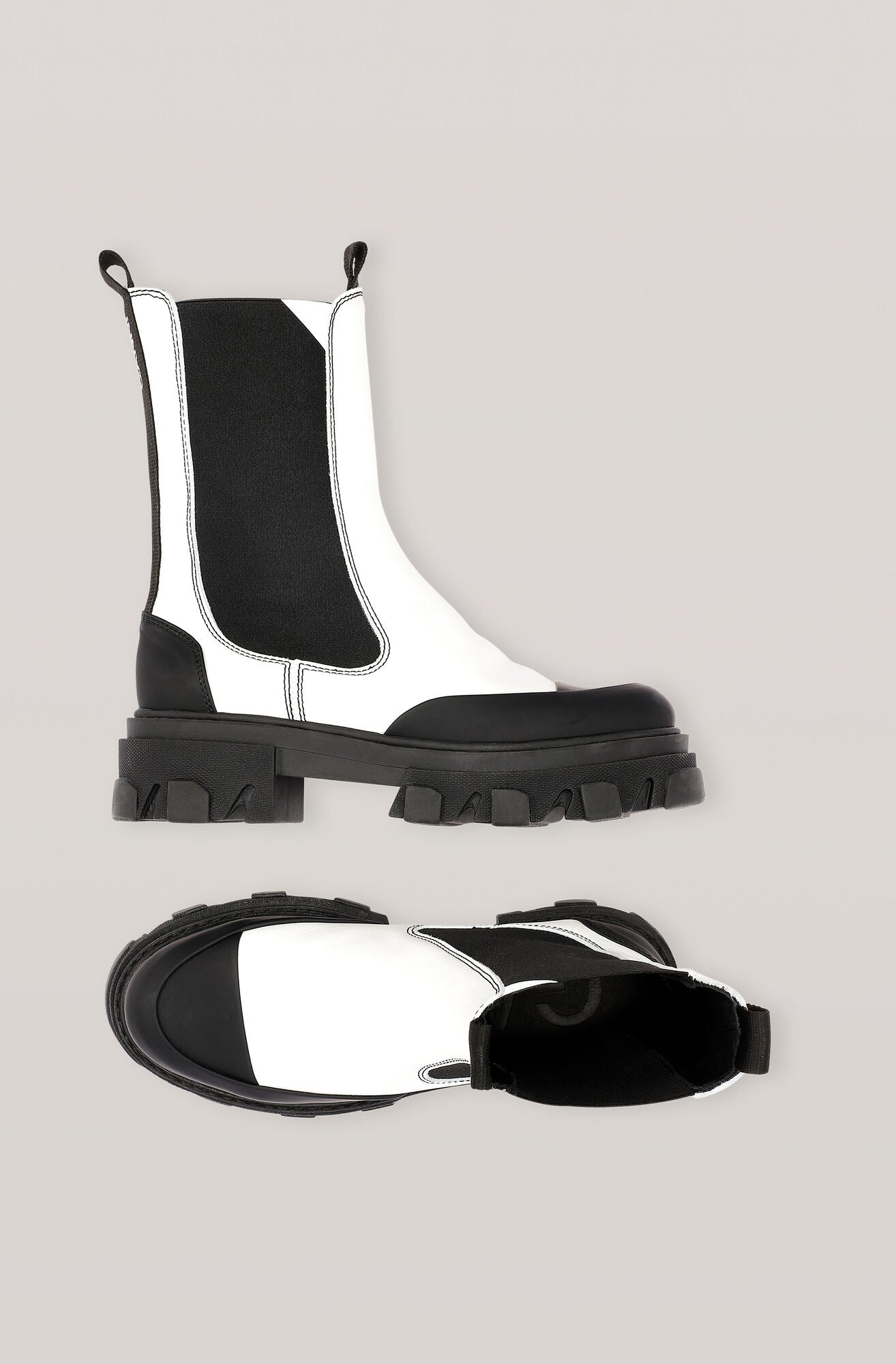 Karakteristiske, halvhøye Chelsea-støvler i skinn med ekstra tykke gummisåler og tåhetter, og en diskrè GANNI-logo på ankelen.