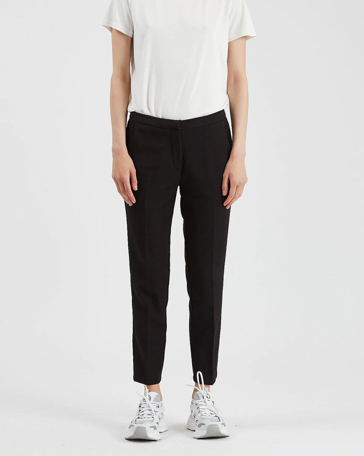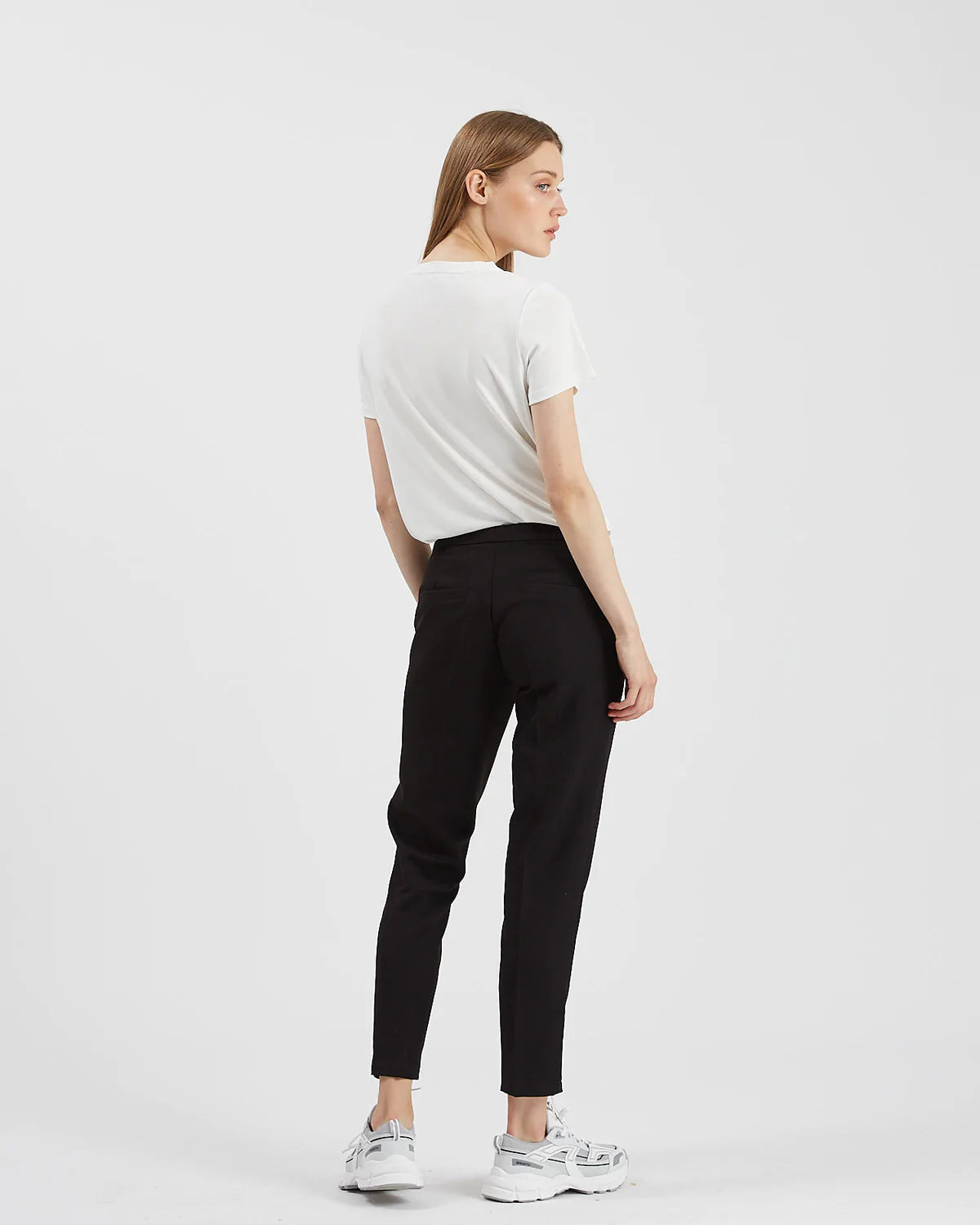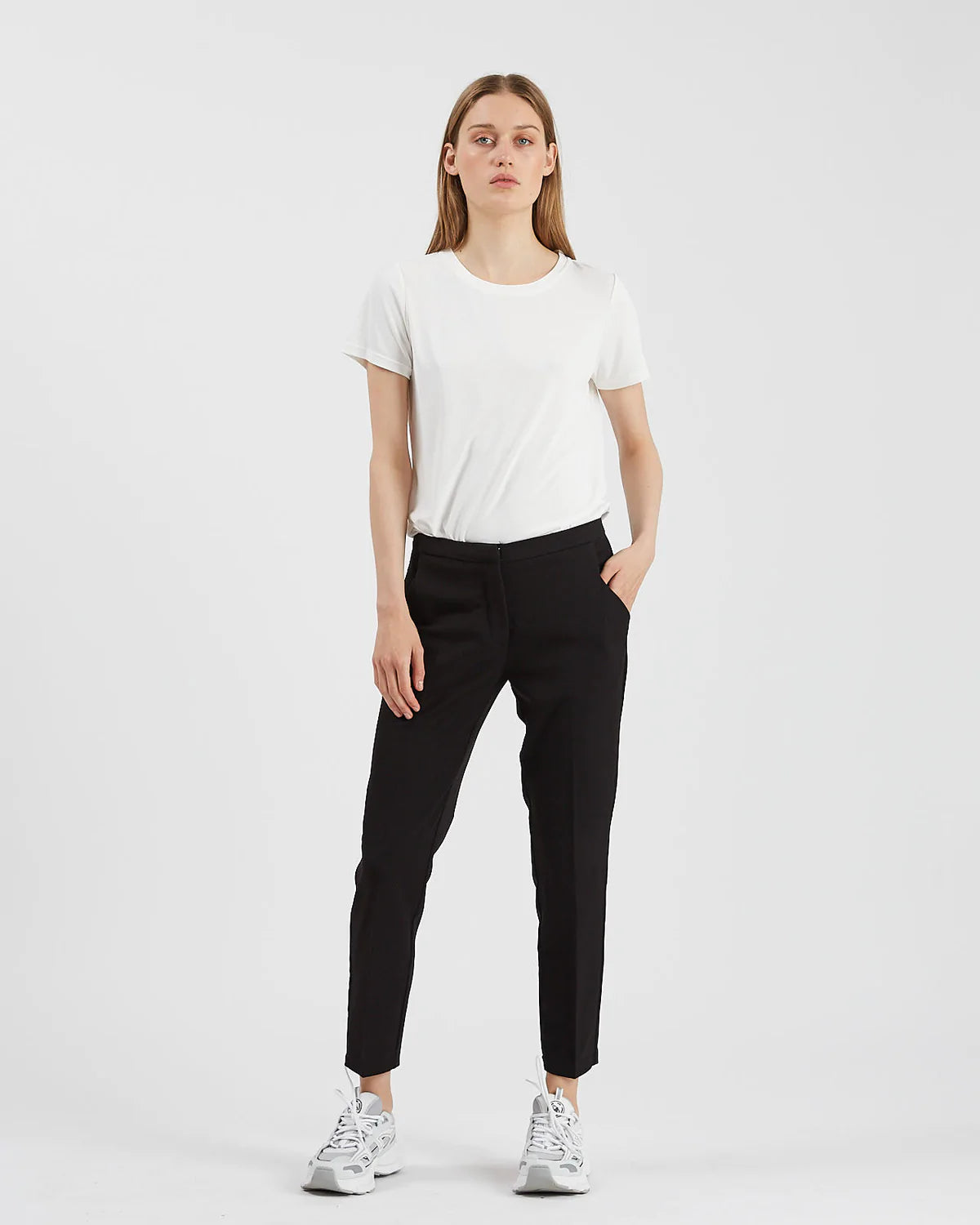 Dressbuksen Halle er laget av en klassisk skreddersydd blanding av viskose og polyester med stretch og er designet med vanlig midje, avsmalnende ben og kommer i ankellengde. Buksen er detaljert med trykkfolder, skrå sidelommer, passpollerte baklommer og skjult glidelås.