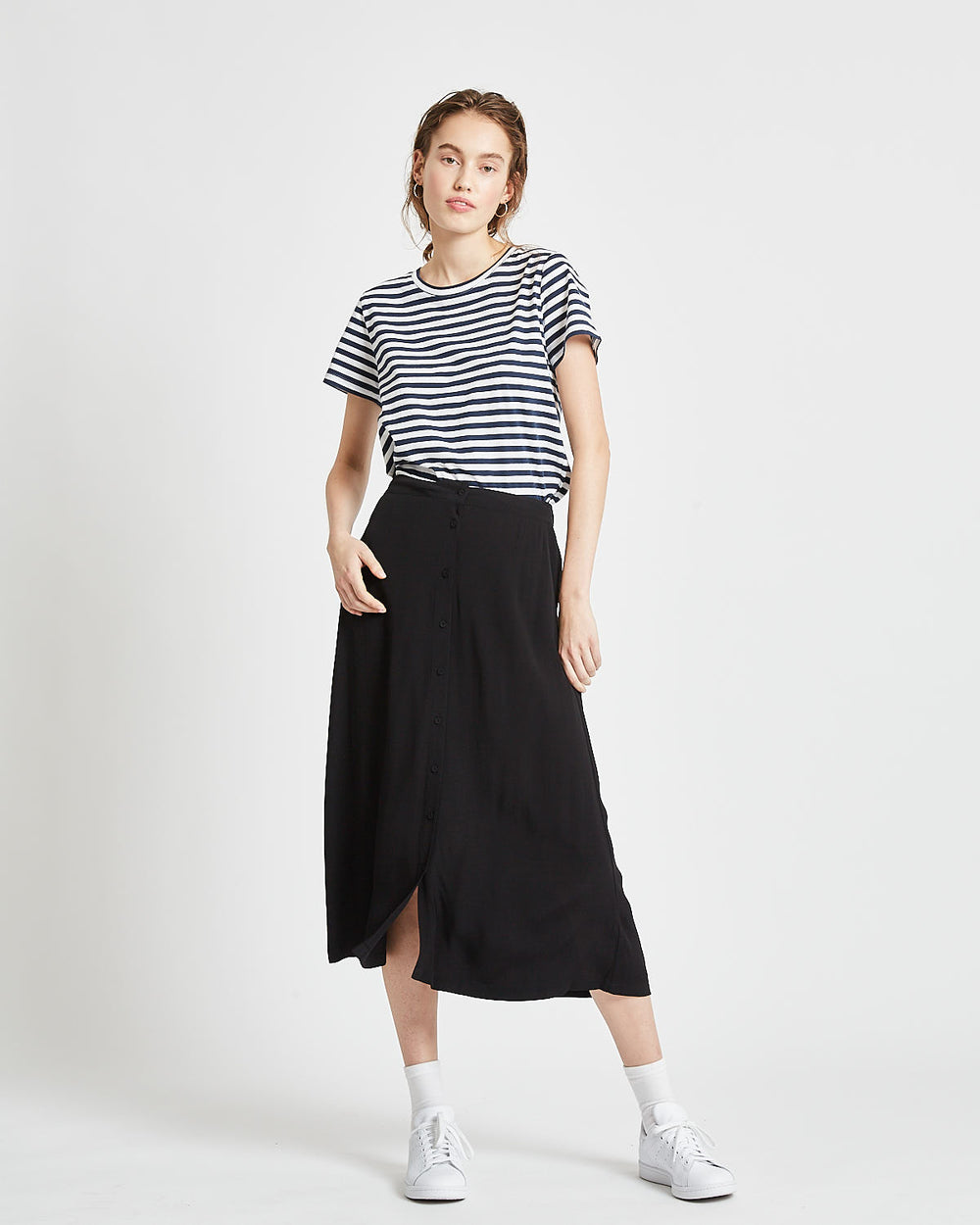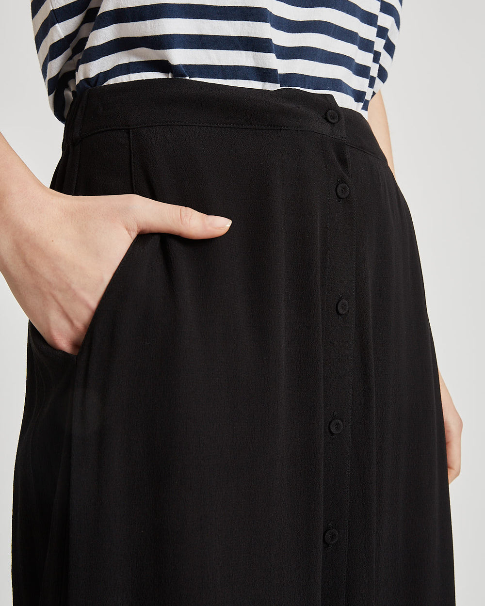 Midiskjørt i lett eco vero materiale med høy midje, skråstilte lommer og dekorative knapper i front.
