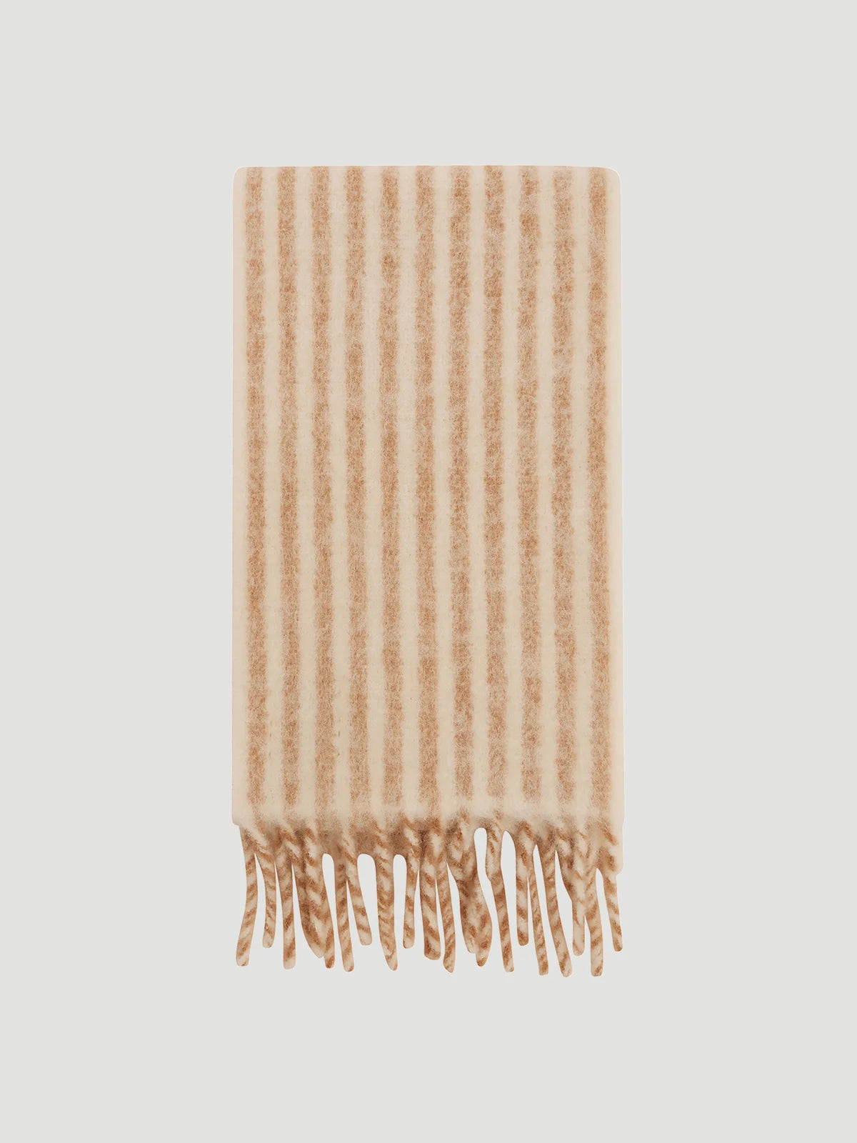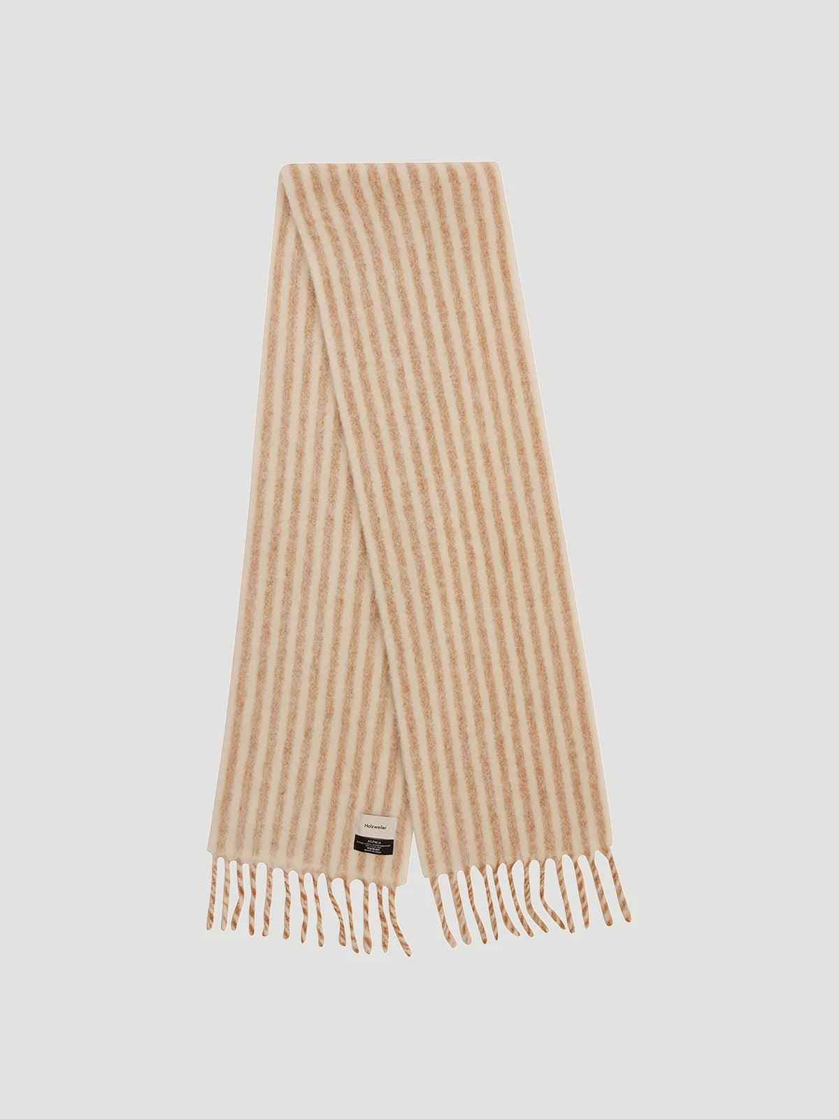 Dette dobbeltvevde skjerfet av en fuzzy-spunnet supermyk alpakka ullblanding er et av Holzweilers tykkeste skjerfstiler. Kommer i en soft beigetone med stripet mønster gjennom hele skjerfet.