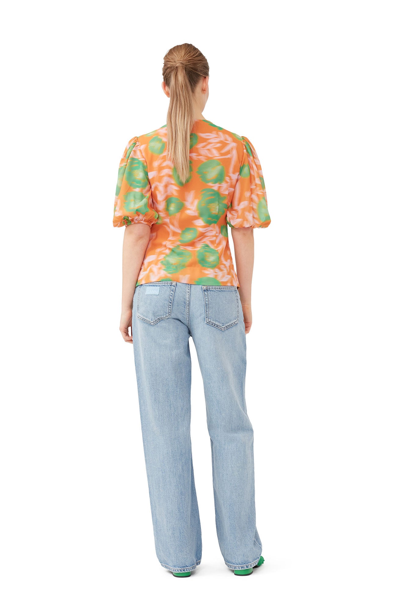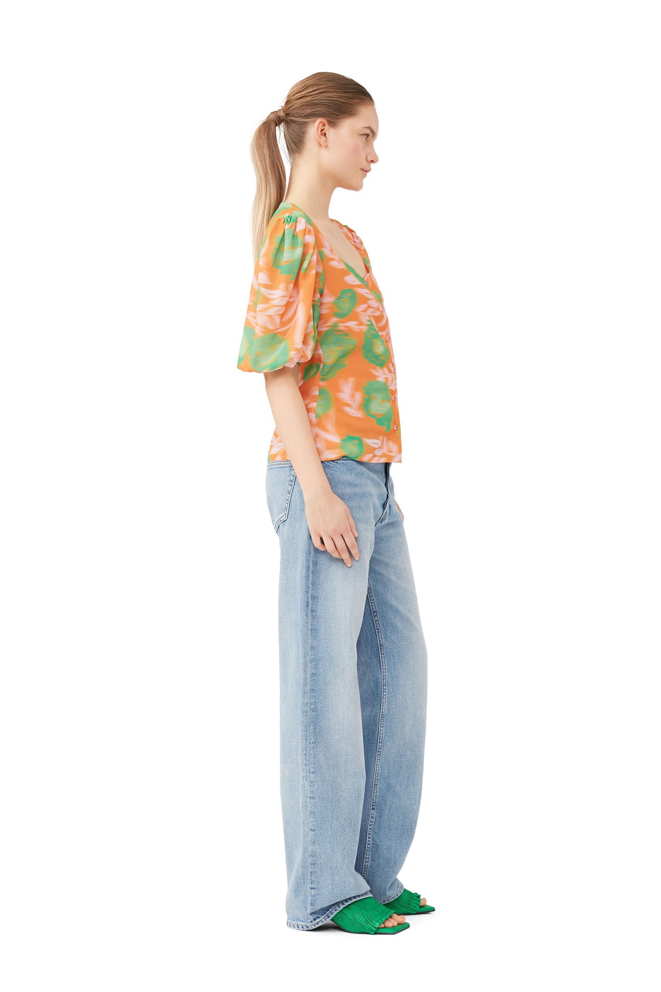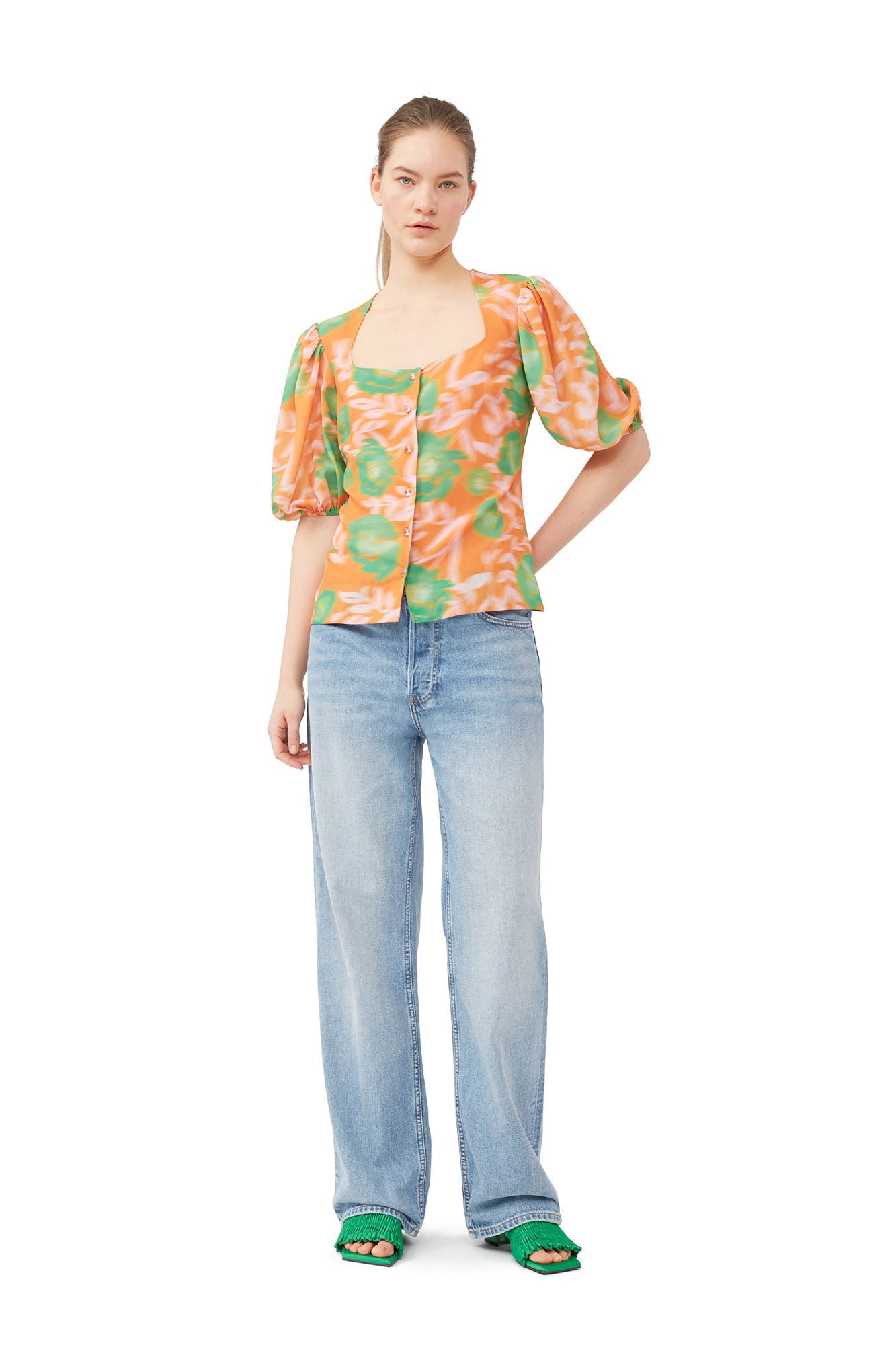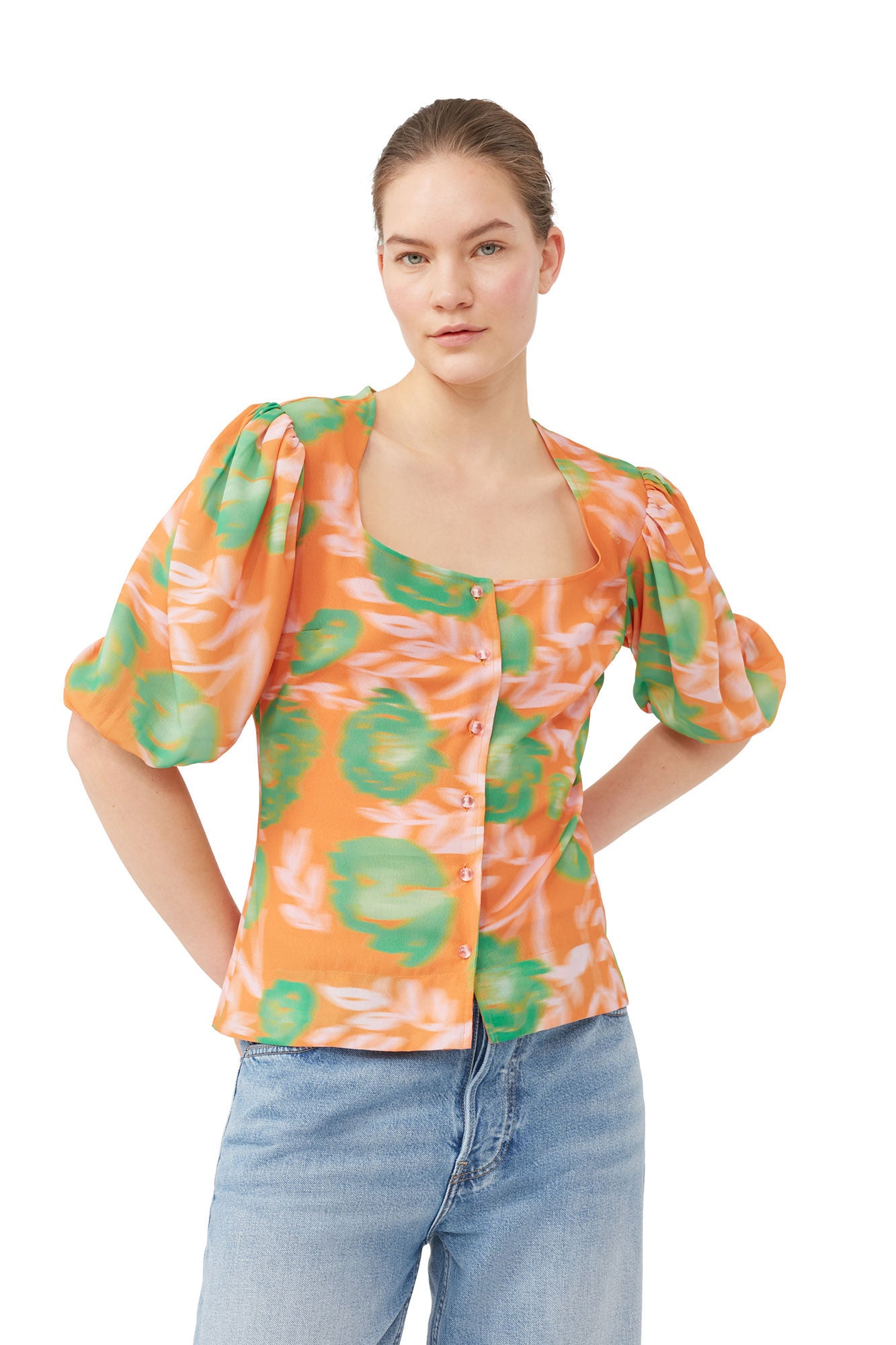 Printed Light Crepe Button Down Blouse Vibrant Orange
