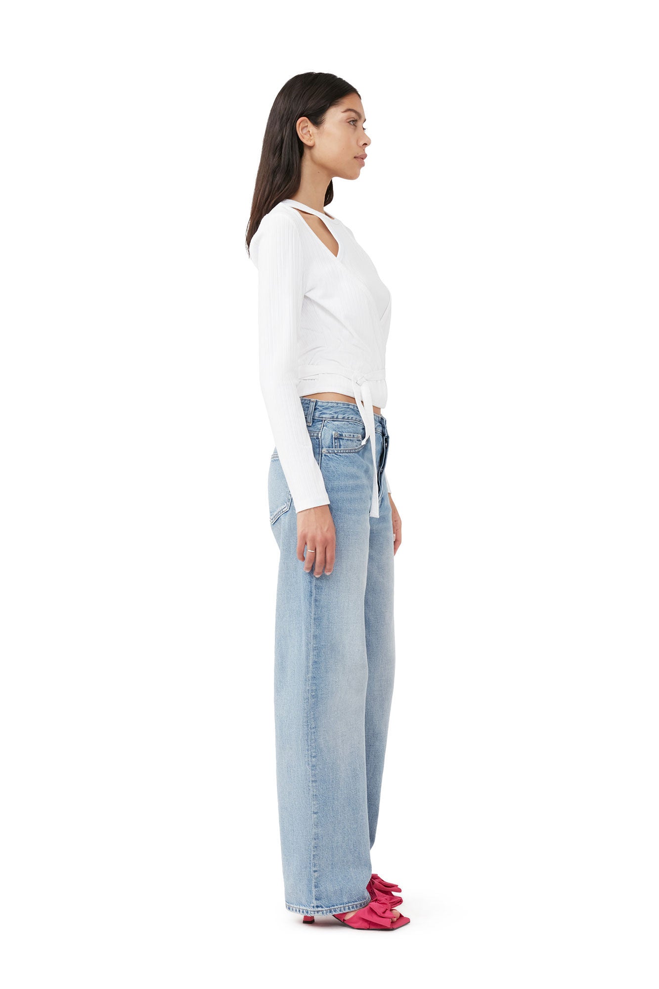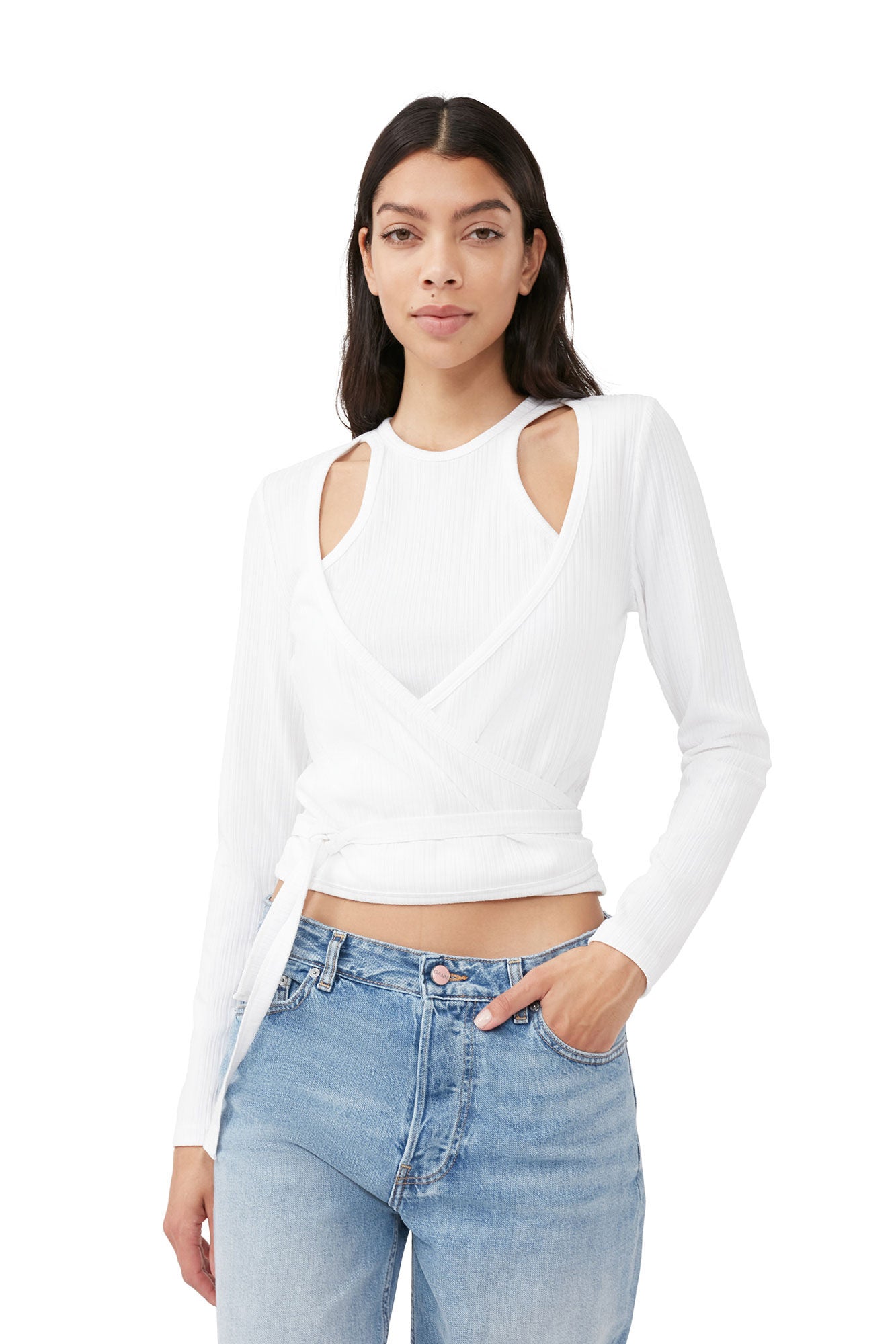 Rib Jersey Wrap Blouse fra Ganni er laget av en blanding av LENZING™ ECOVERO™ fibers. Blusen er designet for en formtilpasset silhuett og har halterneck, lange ermer, utskjæringsdetaljer foran, omslagsdetalj med et knytebånd og en GANNI «butterfly»-logo.