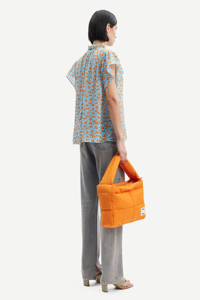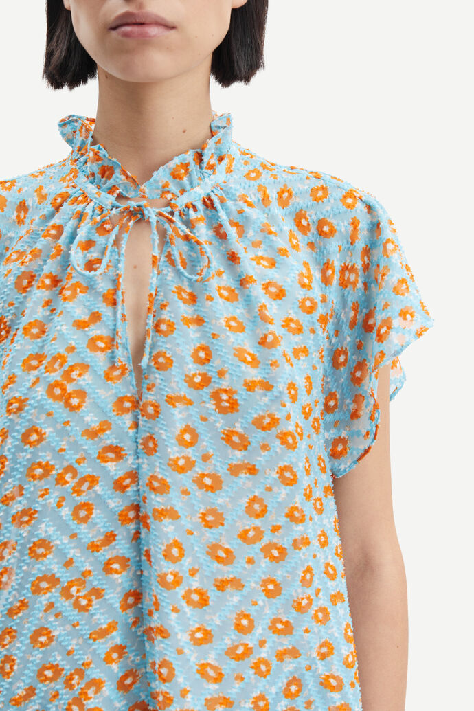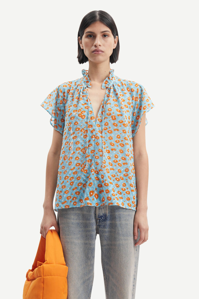 Karookh Blouse fra Samsøe Samsøe er en avslappet bluse med A-silhuett og korte ermer. Halsåpning foran med knytebånd, rynket hals med volangkrage. Toppen er i et nydelig blomsterprint og er laget av 100 % resirkulert polyesterstoff med et trykt og strukturert mønster. Dette produktet er GRS-sertifisert.