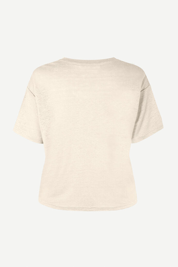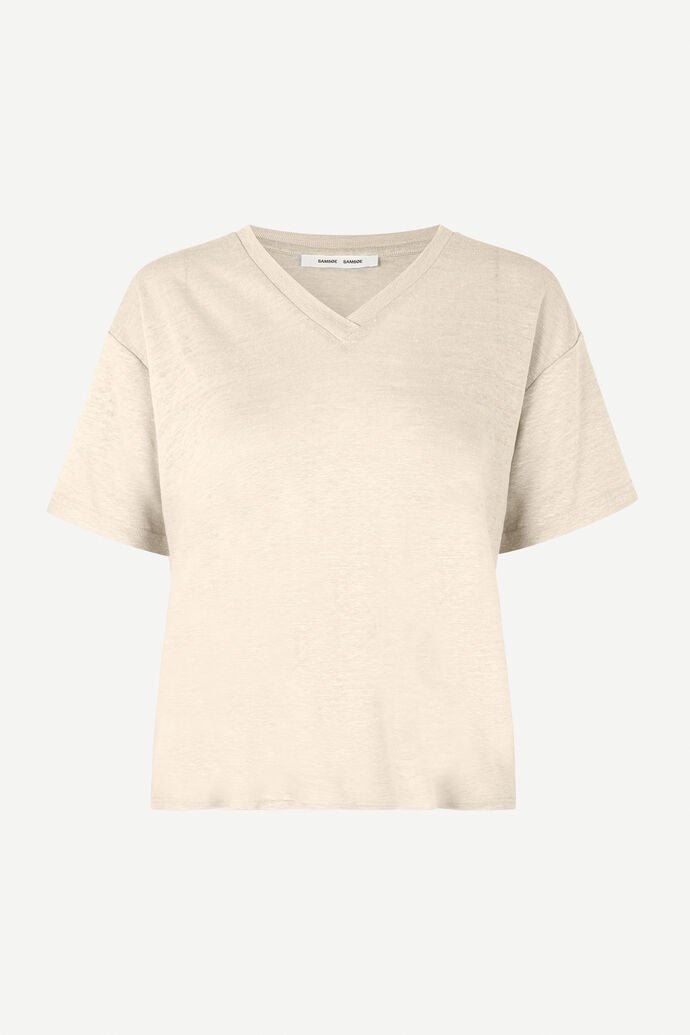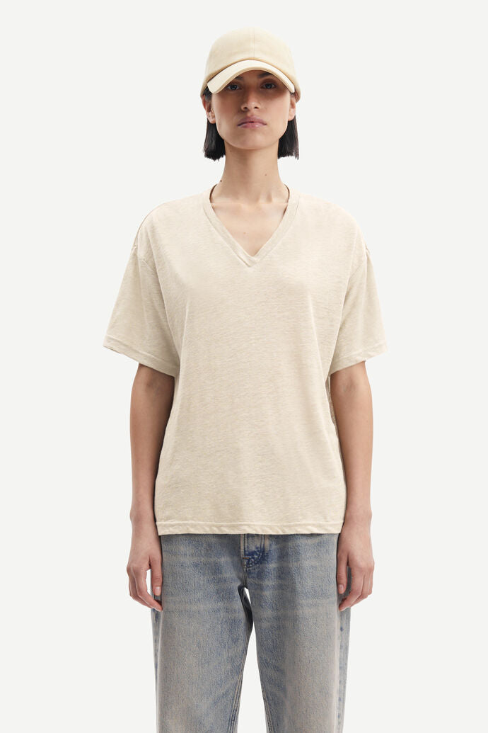 Eli T-Shirt fra Samsøe Samsøe er en vanlig passform, kortermet T-skjorte med V-hals. Overdelen er i 100 % jersey av lin med en naturlig melange-look.