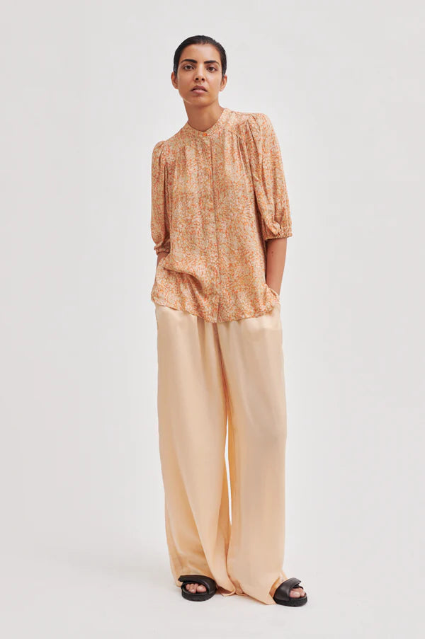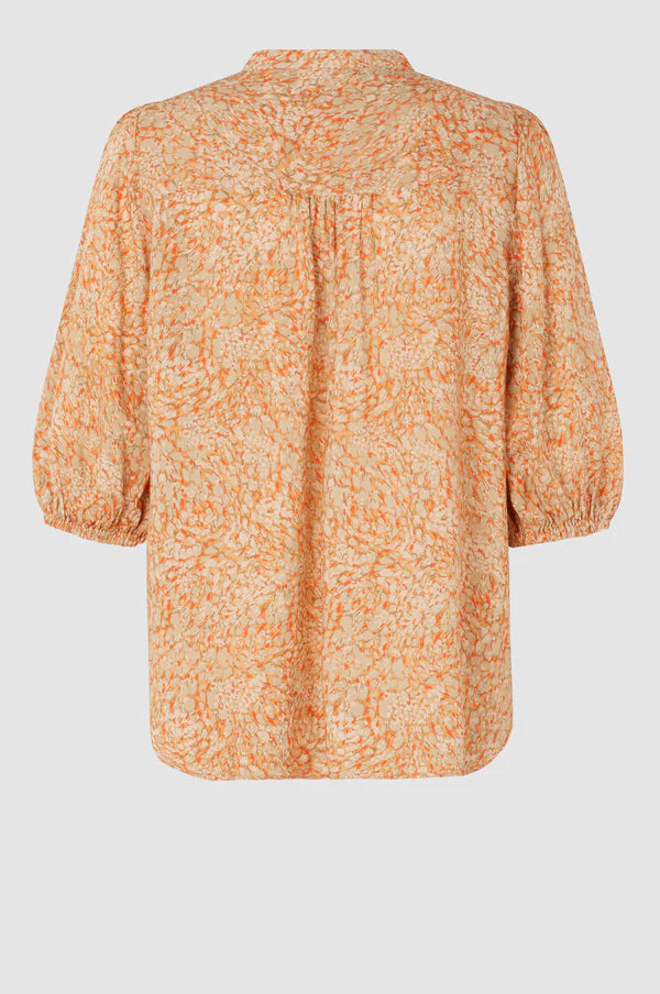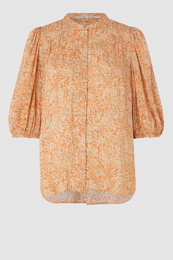 Lampone Shirt fra Second Female er en mønstret skjorte. Laget i lett og flytende stoff med all-over mønster. Med en liten stående krage og stolpe med skjulte knapper med synlig toppknapp. Bærestykke bak med rynket detalj. Lett puffede skuldre med korte ermer med elastiske ender. Avslappet passform