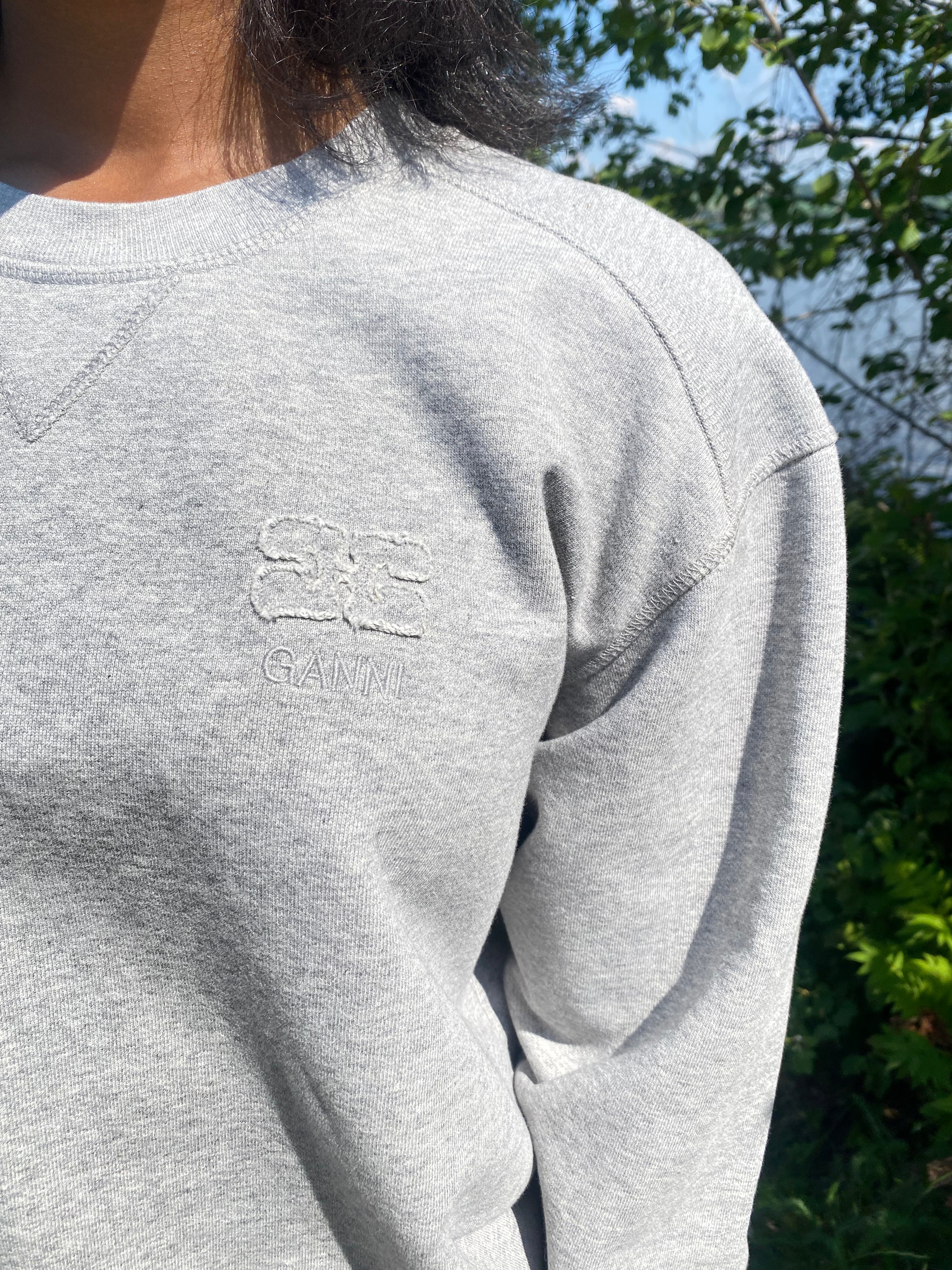 Isoli Drop Shoulder Sweatshirt fra Ganni er en enkel og tidløs genser, med drop skuldre og brodert Ganni-logo i front.