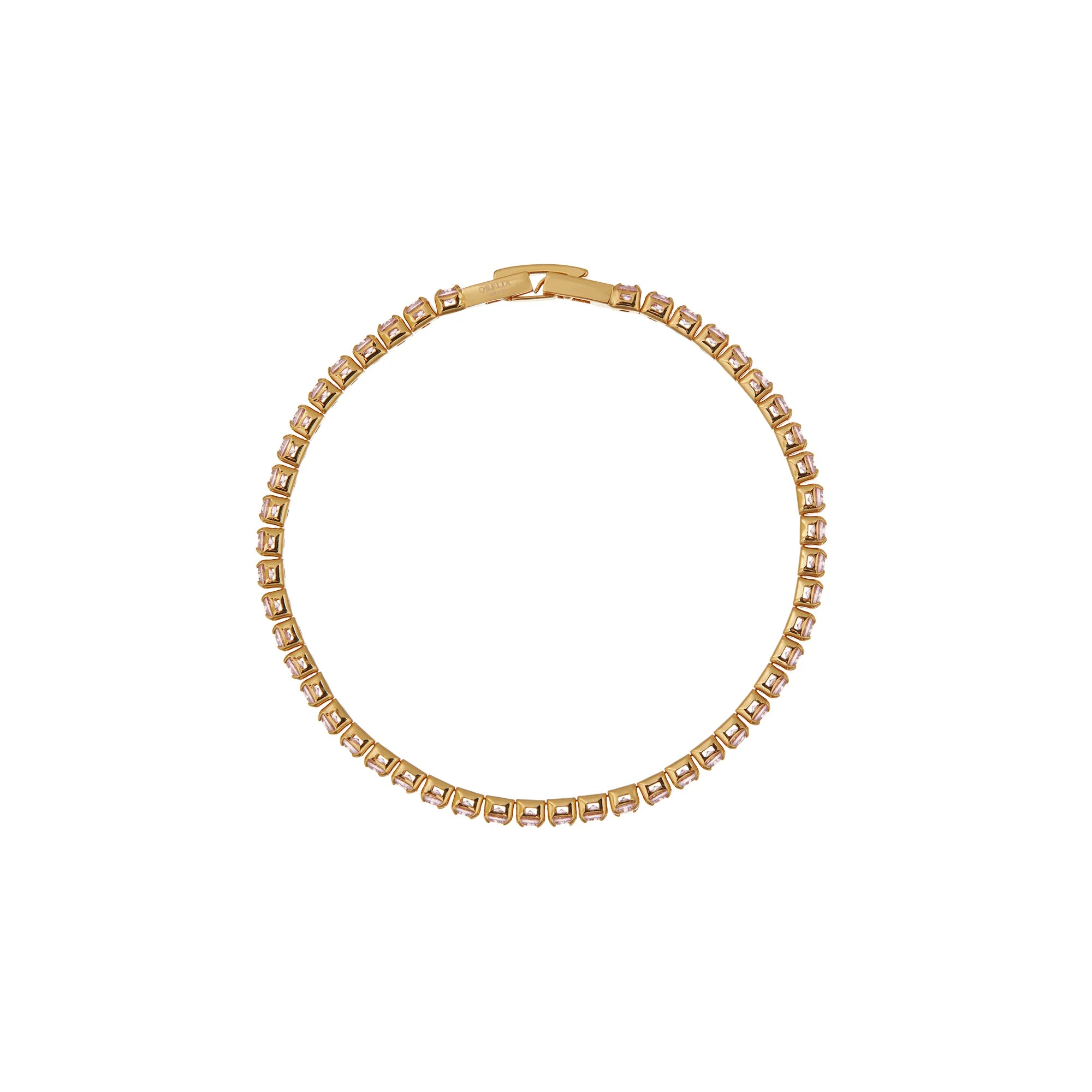 Tennis Bracelet fra Orelia er en klassiker. En tynn rad med cubic zirconia cupchain-steiner i en nydelig Light Pink farge, på et lett gullforgylt armbånd.