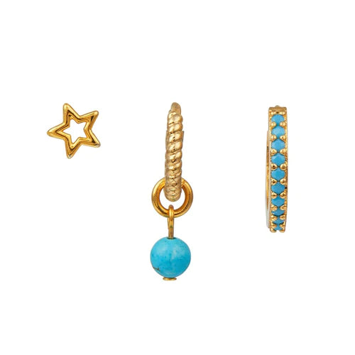 Turquoise Hoop & Star Ear Party fra Orelia eret nydelig sett med 3 øredobber. Med en søt stjerneformet stud, en huggie med en turkis sten og en huggie hoop i pave-stil dekket med turkise steiner.
