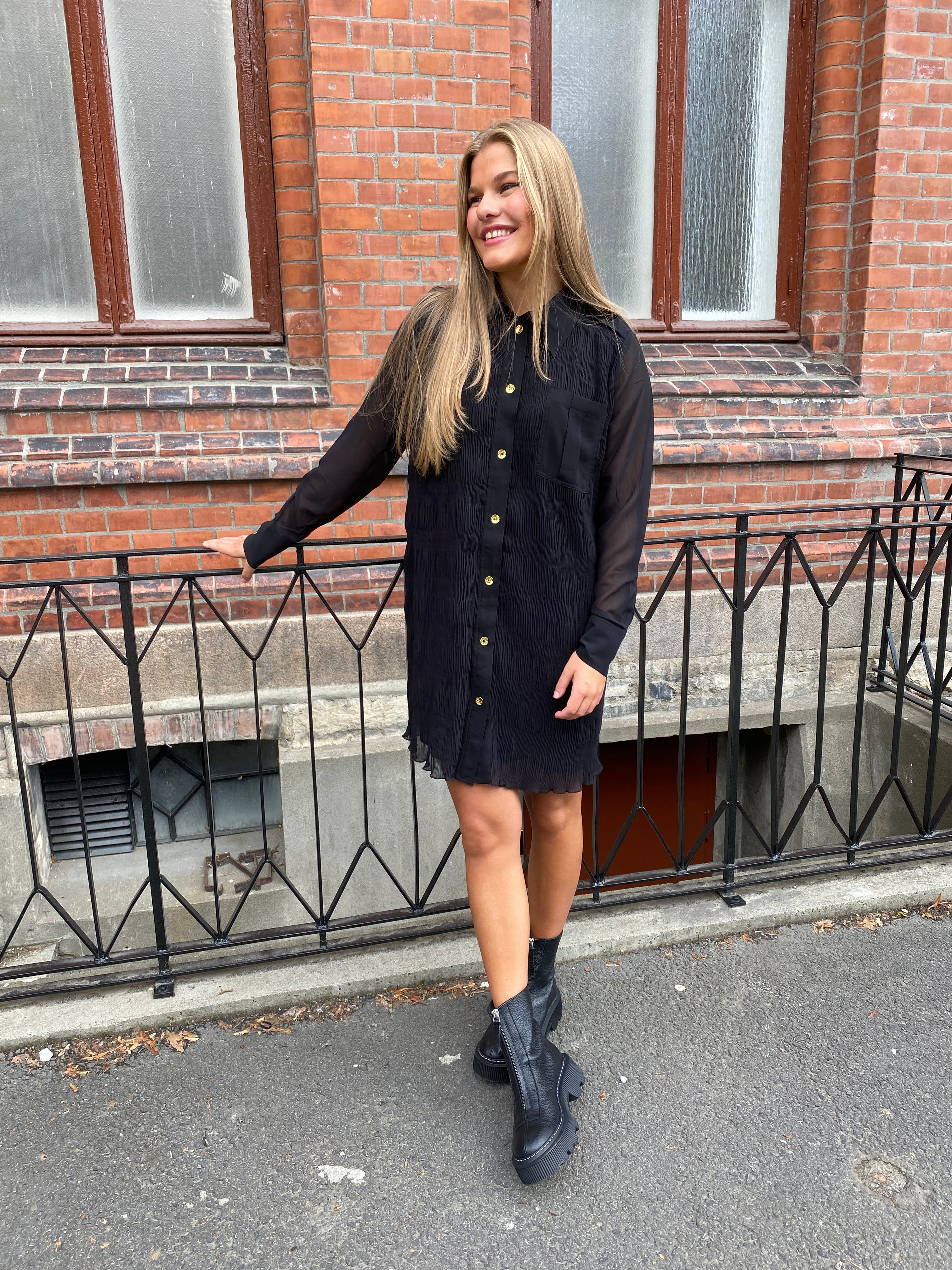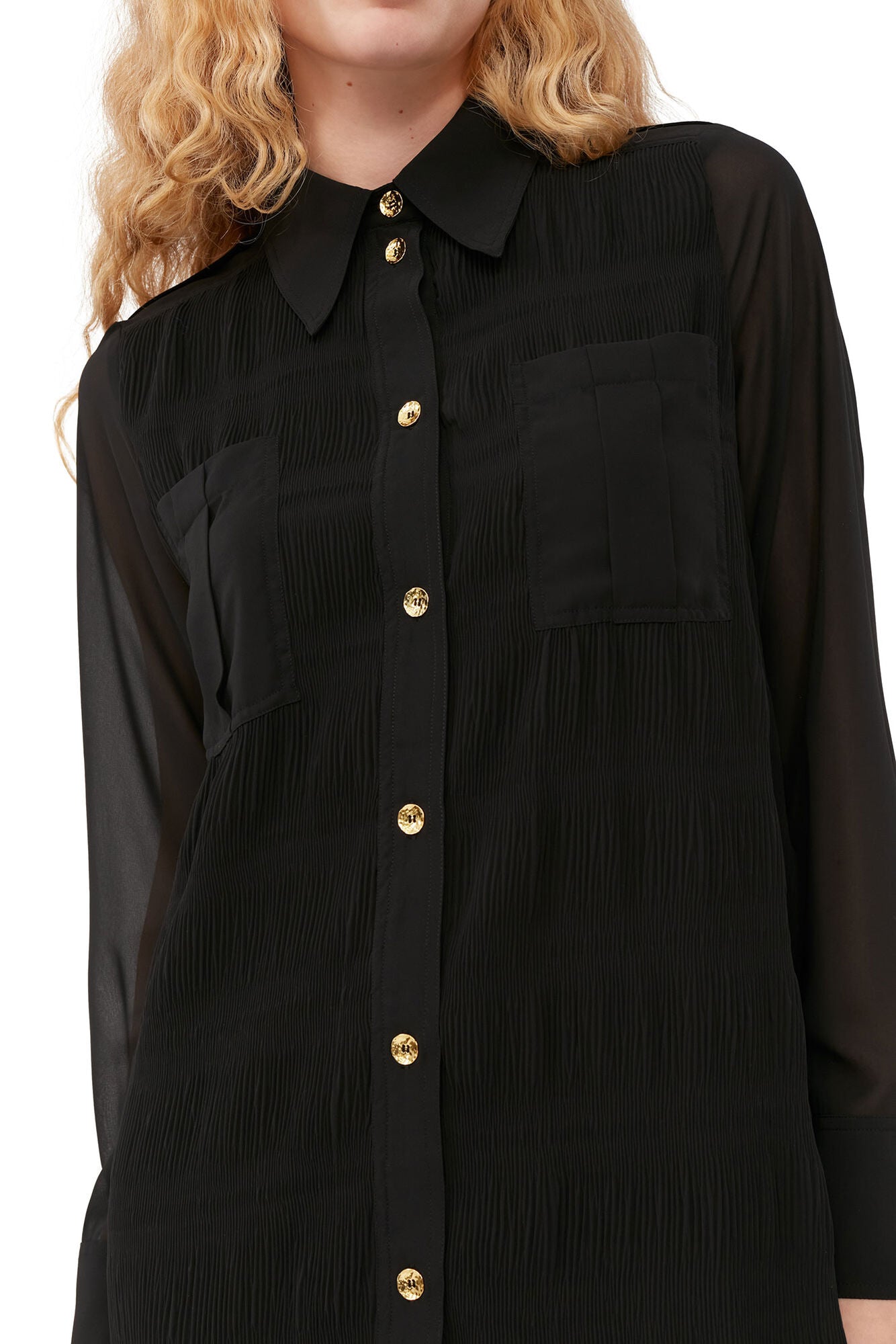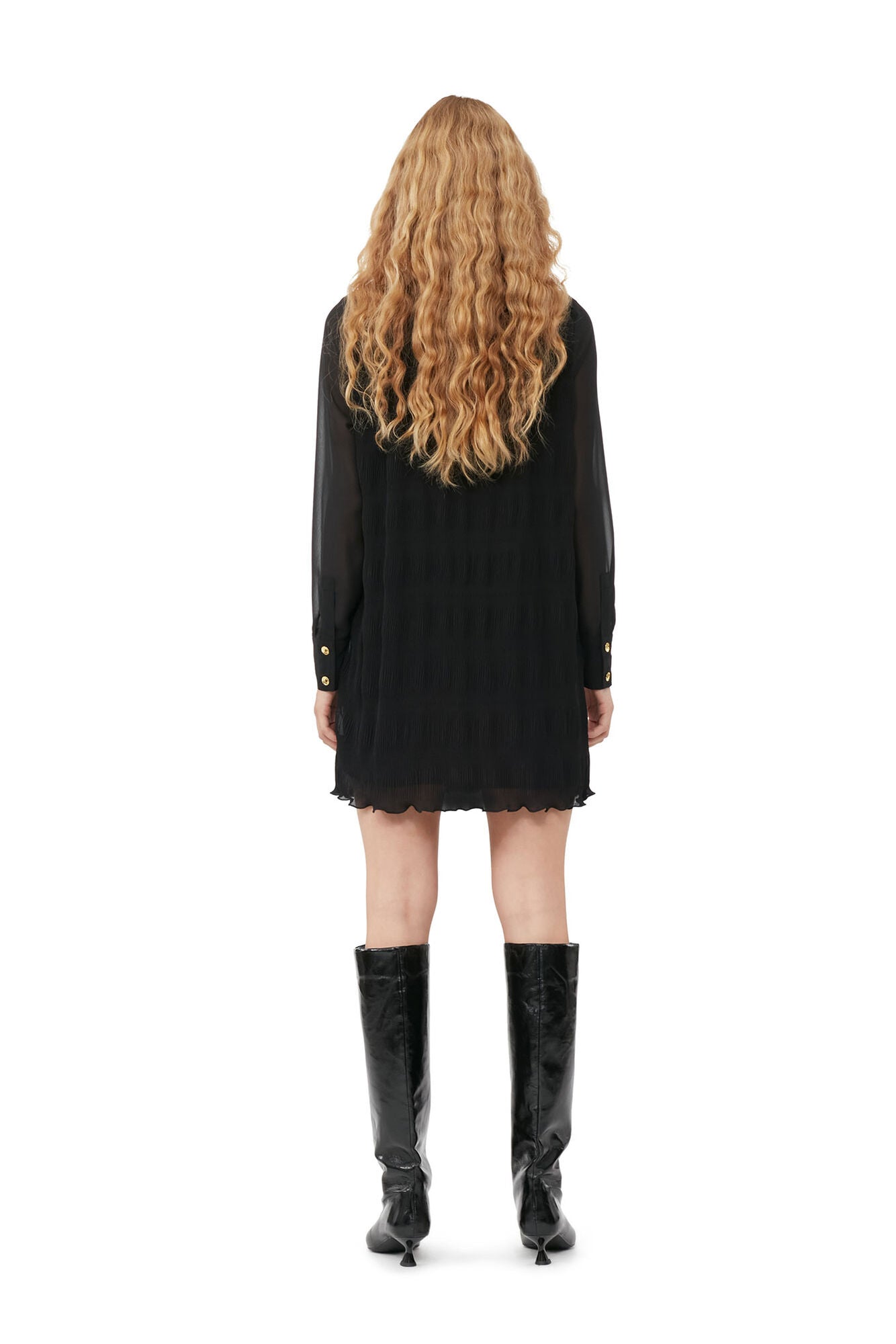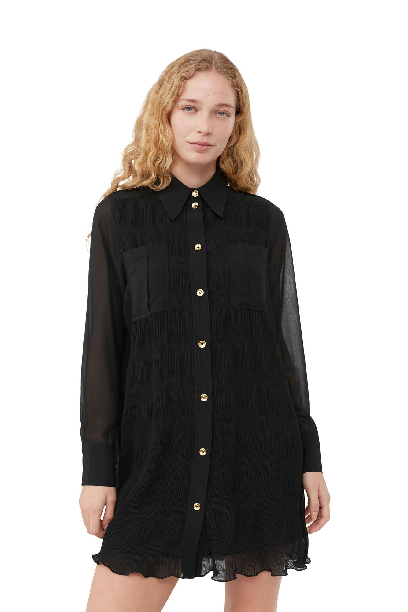 Pleated Georgette Shirt Dress Black
