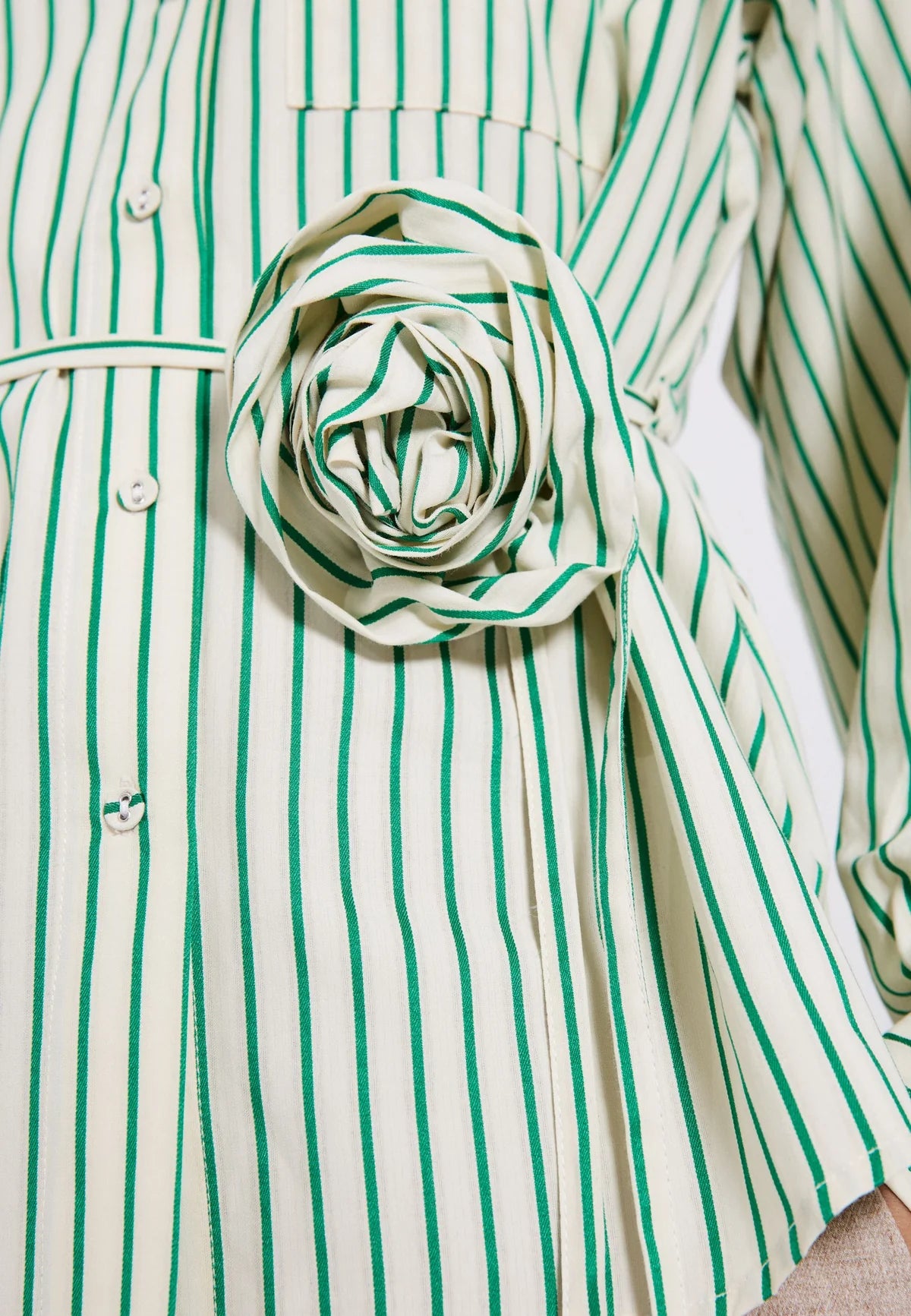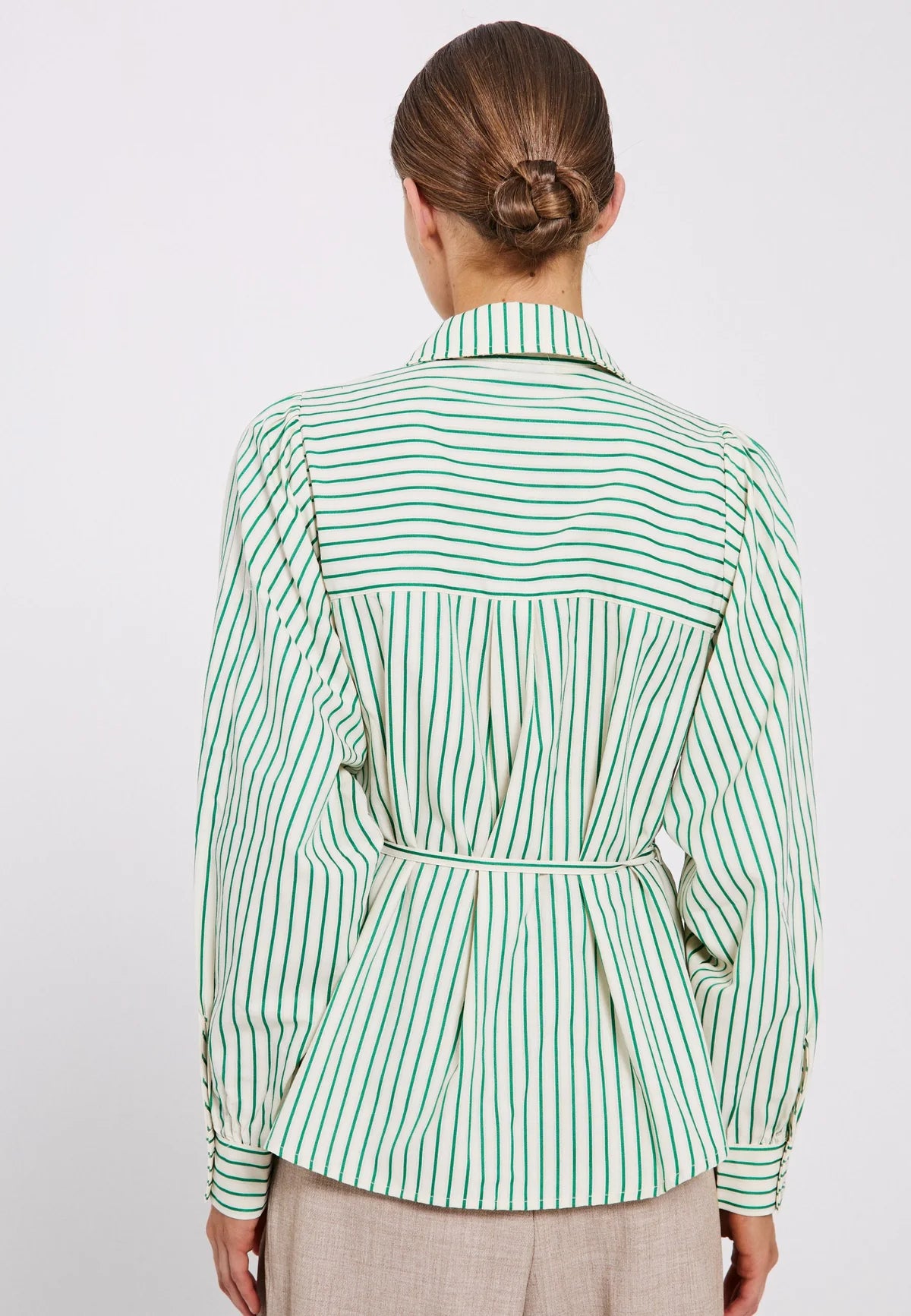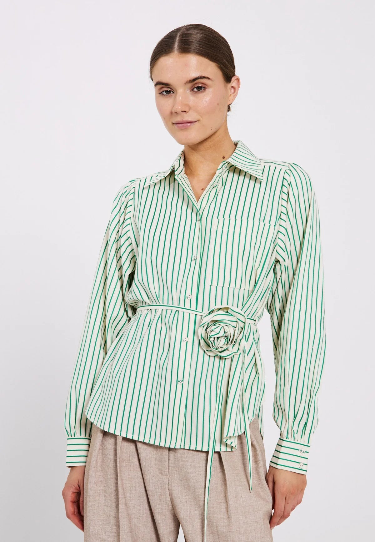 Linna Shirt fra NORR er en lett og deilig skjorte, med grønne striper. Skjorten har vide puffede ermer, og et avtakbart belte med rose.