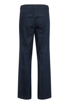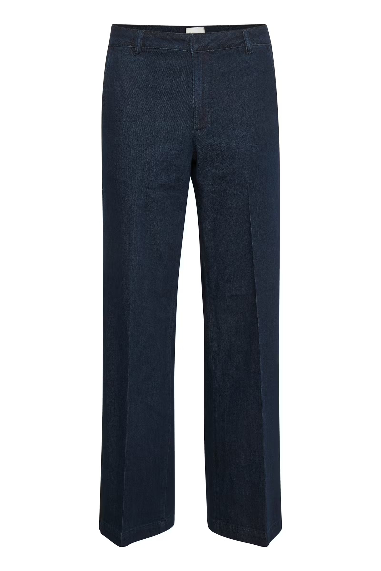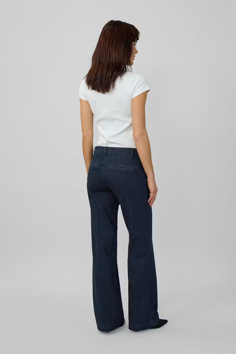 Lara er en bukse i et ultrasoft stoff med superkomfortabel stretch fra My Essential Wardrobe. Buksen har en litt løs passform, vide ben og middels høy midje. Mørkeblå denimfarge.