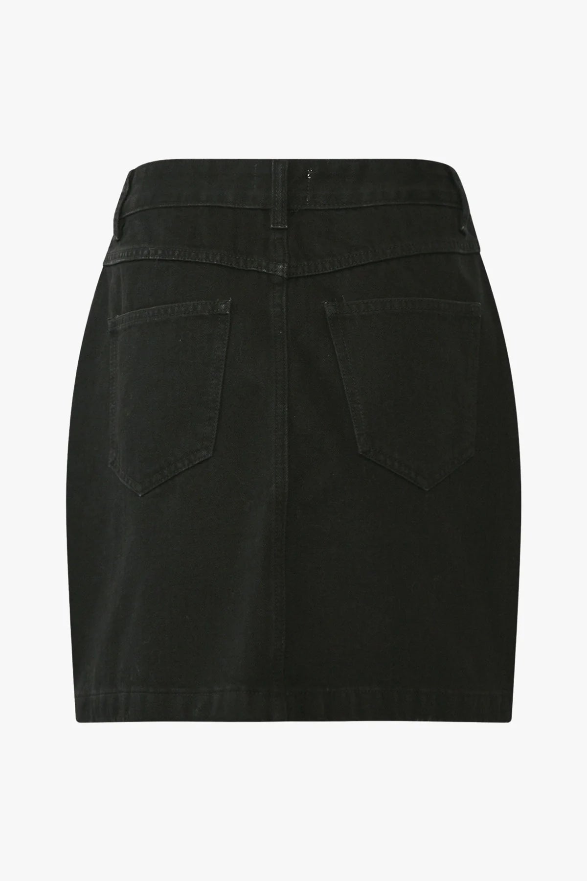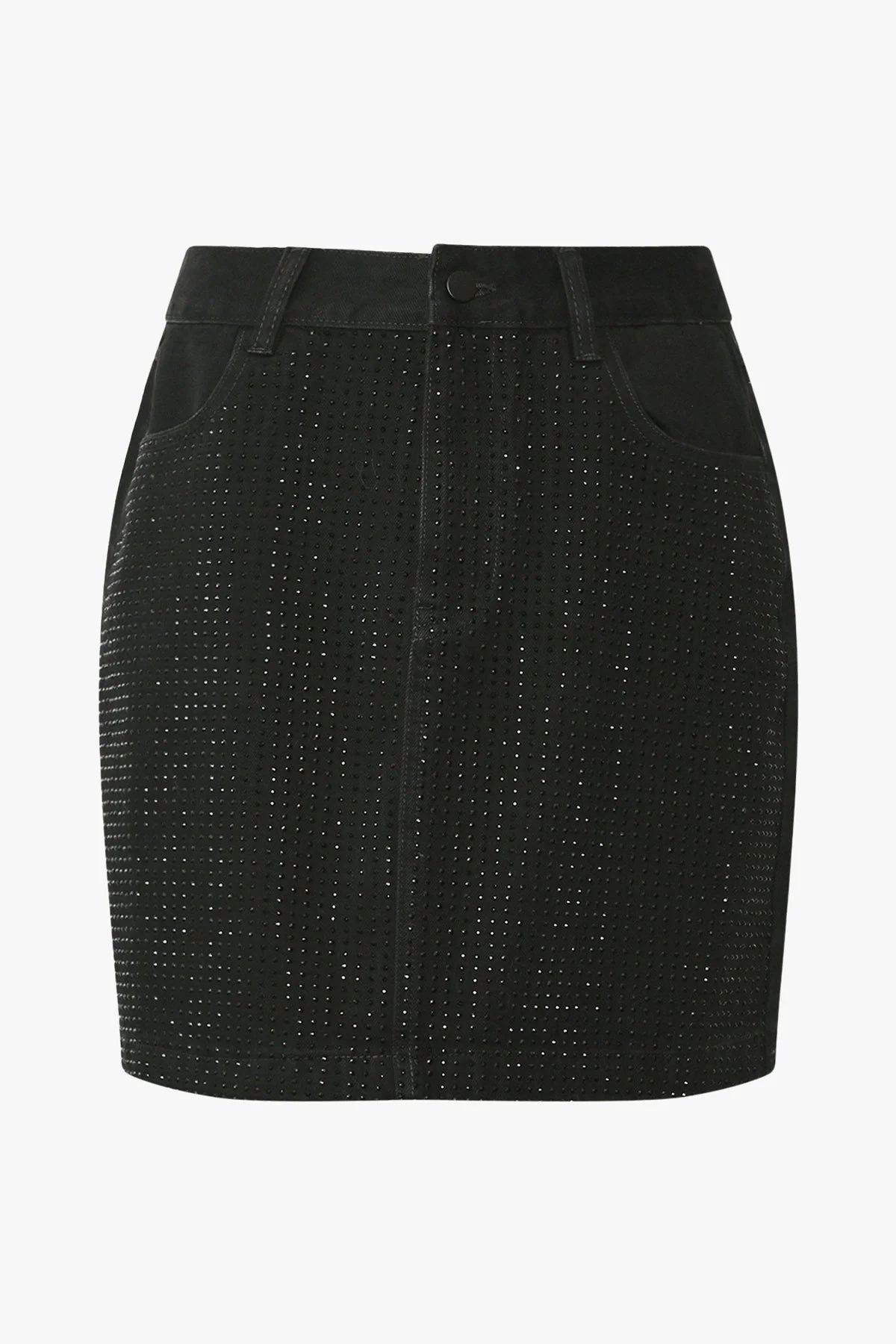 Kit Skirt fra Noella er et denimskjørt dekket med små pyntesteiner i front. Skjørtet har stikklommer i sidene, lommer bak, og lukkes med knapp og glidelås. Normal passform.