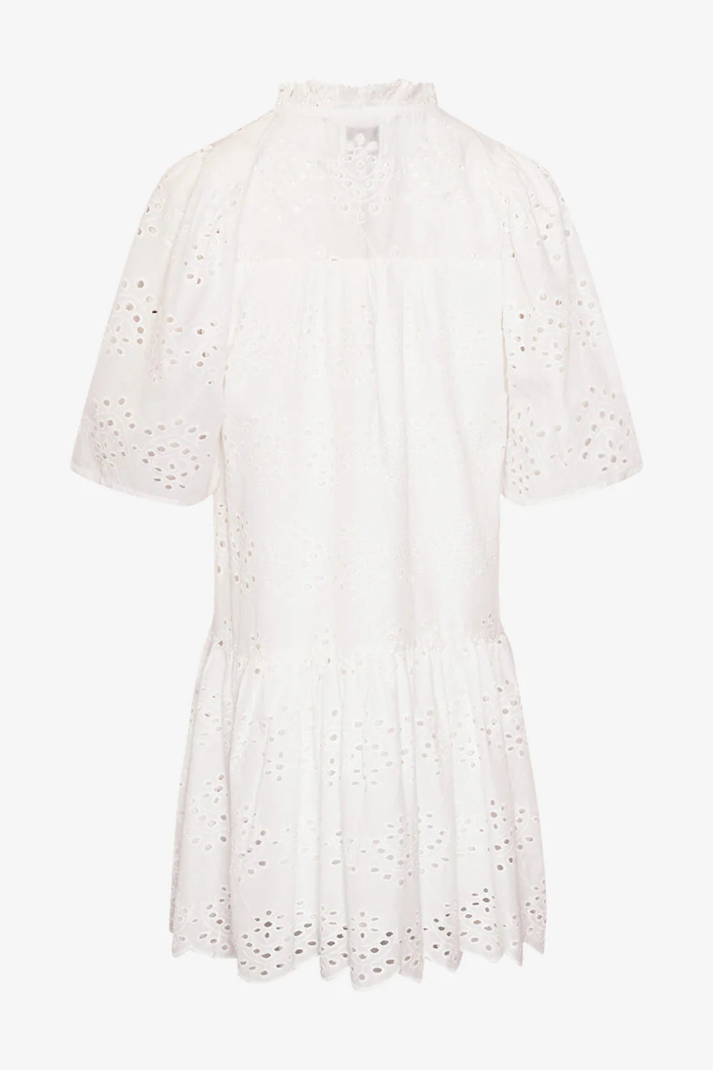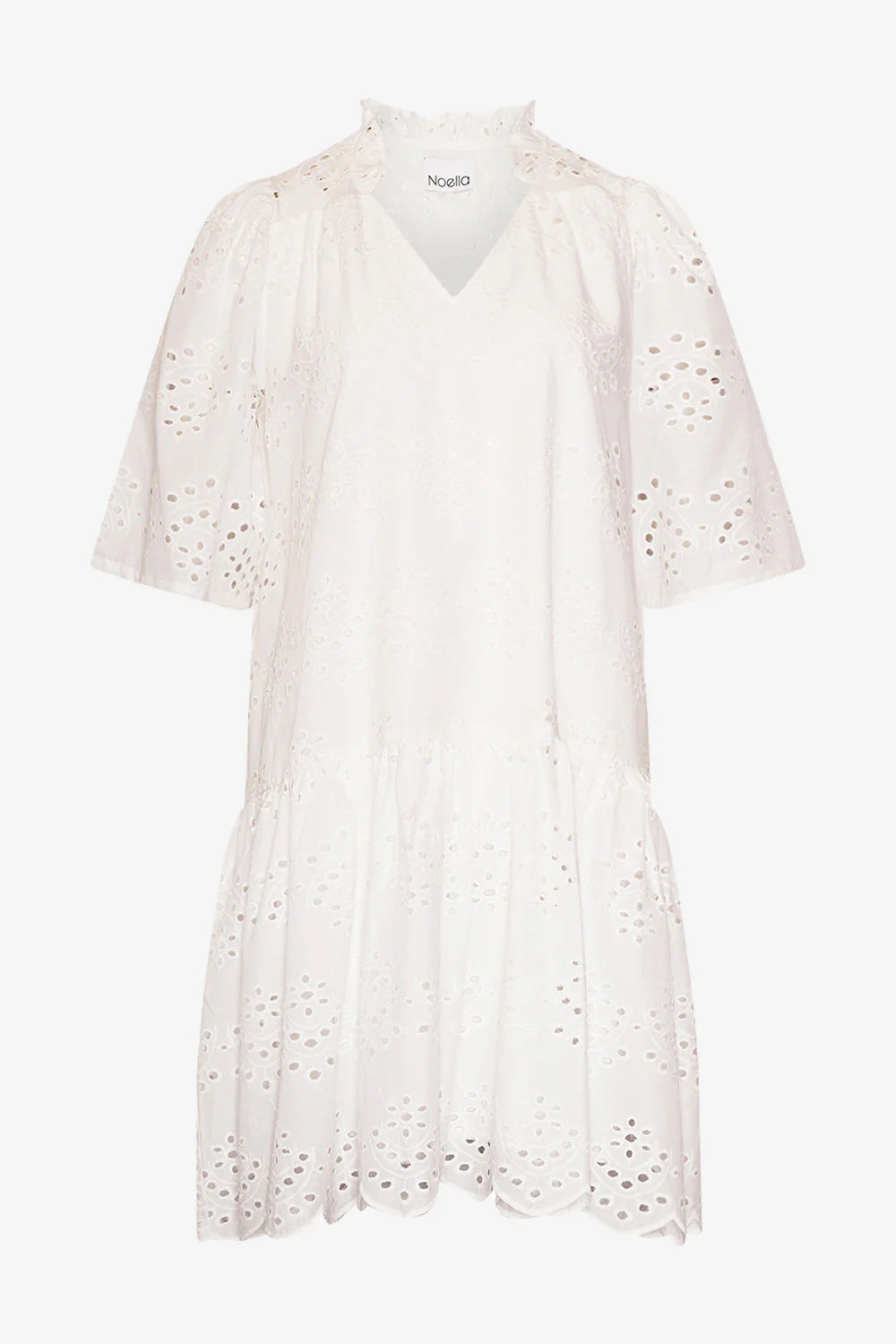 Lillia Dress fra Noella er en lett og luftig sommerkjole i brodert bomull med feminine detaljer. Kjolen har korte puffede ermer, rysjekant i halsen og et avslappet, A-linjeformet snitt som faller flatterende over kroppen. Den broderte anglaise-strukturen gir kjolen et romantisk uttrykk, mens den sorte fargen gjør den allsidig og enkel å style til både hverdags og fest. Bruk den med sandaler for en casual look, eller kle den opp med hæler og smykker for en mer pyntet anledning.