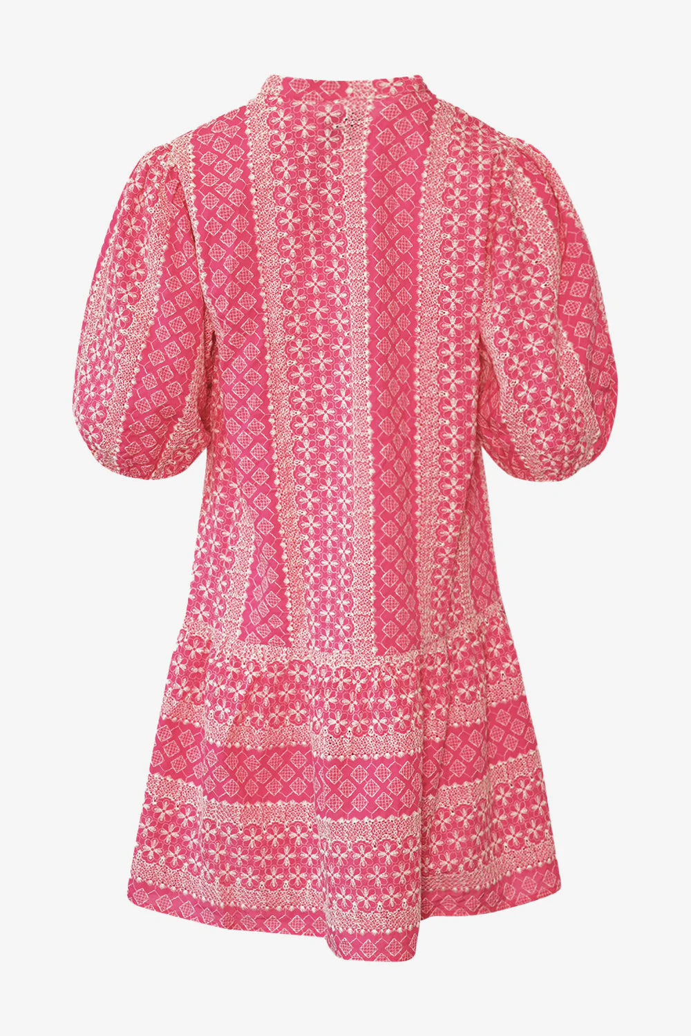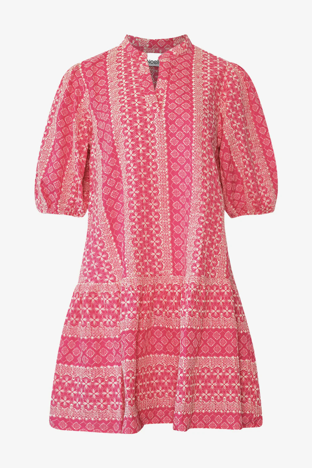 Lillianna Dress i fargen Pink Sugar Combo fra Noella er en leken og sommerlig kjole med en avslappet passform. Kjolen har korte puffede ermer med strikk nederst, en liten V-utringning og ståkrage for et feminint uttrykk. Det livlige mønsteret i rosa og hvite nyanser gir kjolen et friskt og bohemsk preg, mens den voluminøse skjørtedelen med kapper skaper en flatterende og luftig silhuett. Perfekt til både varme hverdager og sommerlige anledninger – bruk den med sandaler til stranden eller med sneakers for en avslappet bylook.
