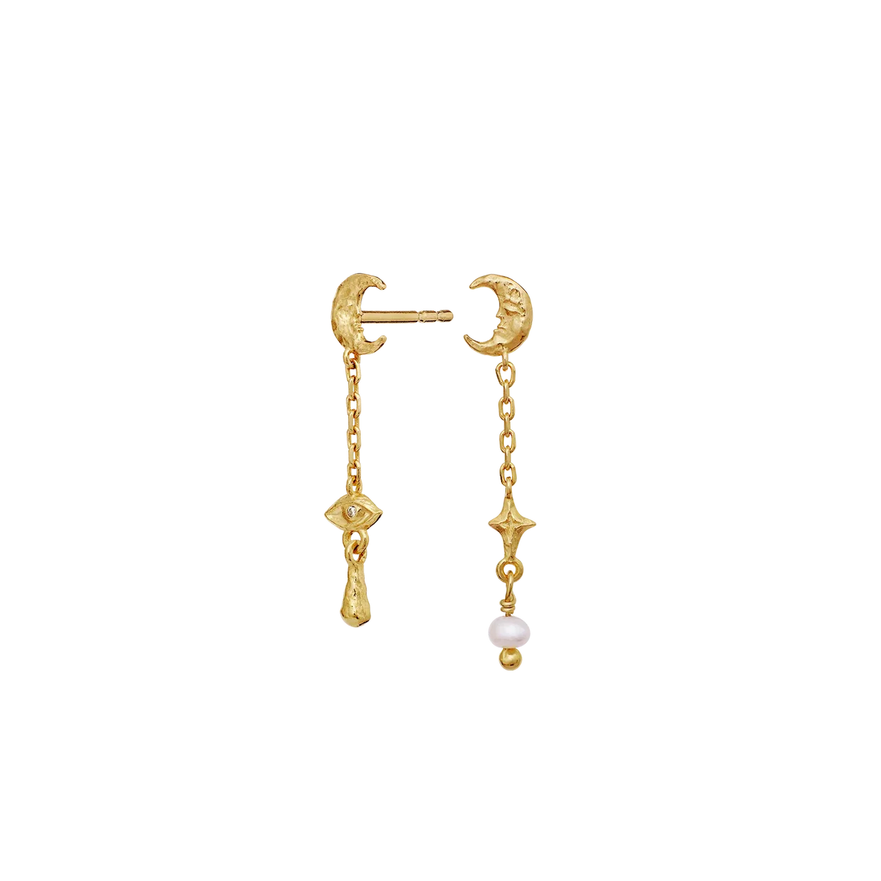 Opplev nattens magi med Maanestens Beatrice-øreringer. Med fantasifulle halvmåner, observatørens øye og en ferskvannsperle, utstråler de scenens fortryllende eleganse.
