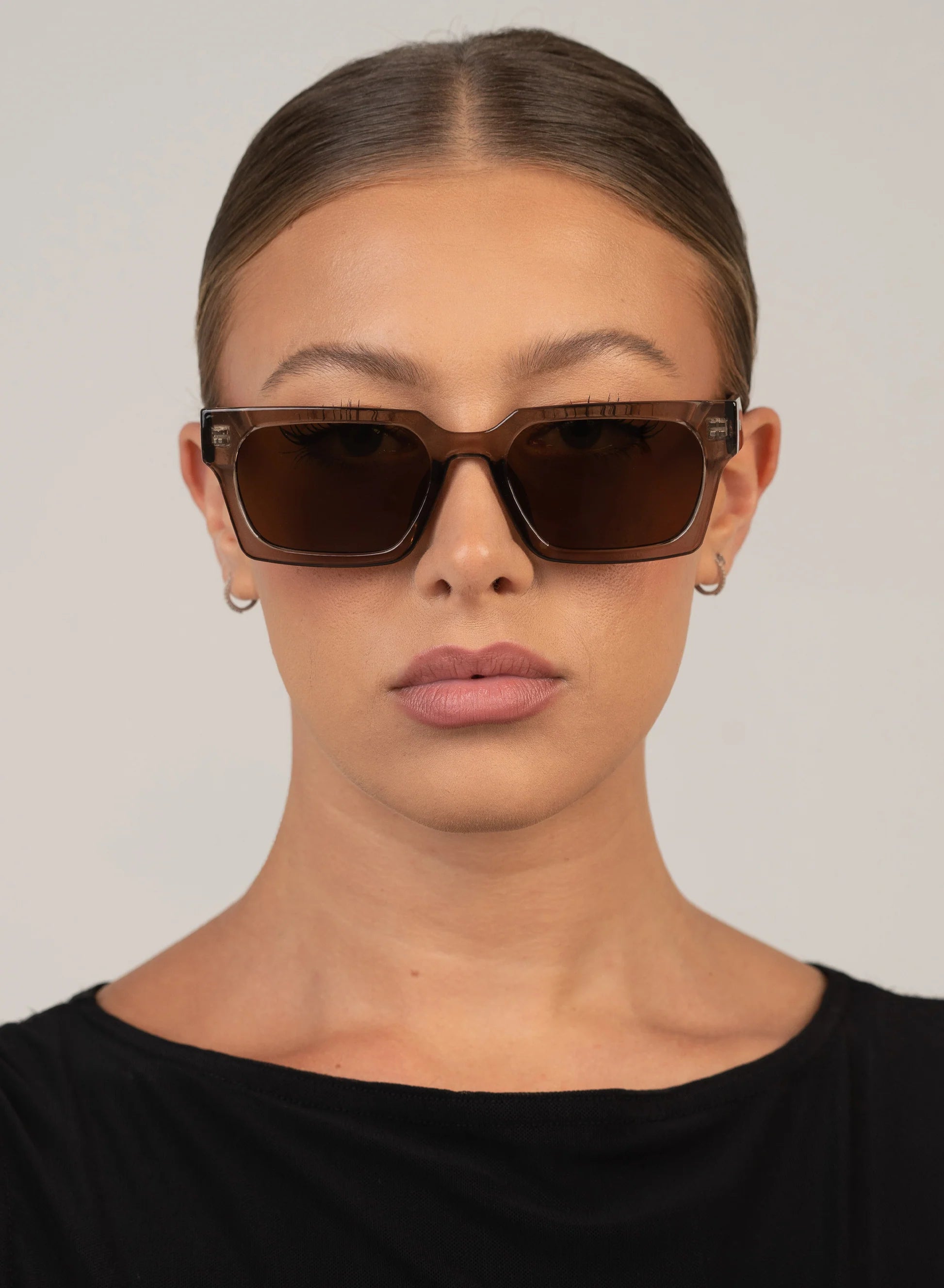 Roco Trans Olive fra Otra er superkule solbriller med firkantet ramme i skinnende sort og grønne linser. Linsekategori 3 gir god beskyttelse mot sollys, og de har 100 % UV-beskyttelse. Solbrillene leveres med et beskyttende vegansk etui.