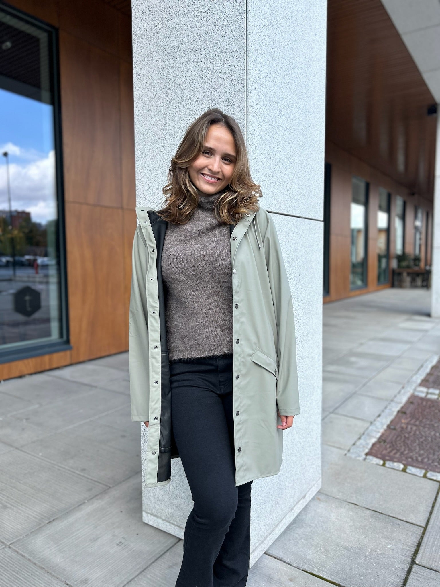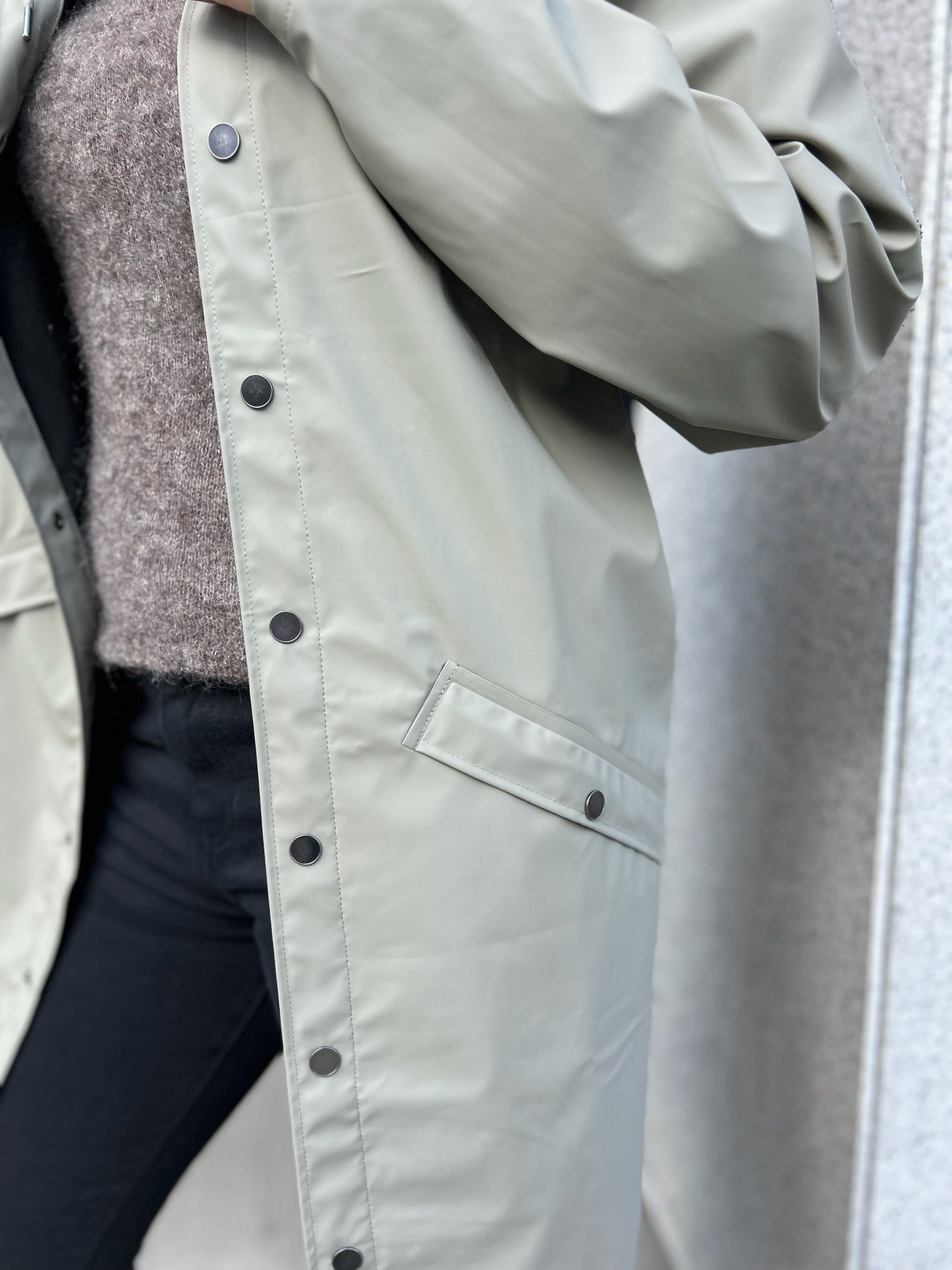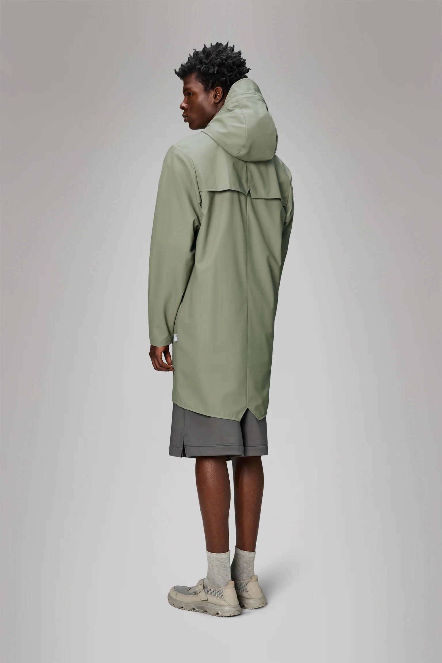 Den elegante draperingen gjør jakken lett å style, mens underarmsventiler og en skjult ventilasjonsåpning i ryggen gir økt pusteevne og komfort. Long Jacket er laget av Rains’ signatur PU-materiale med sveisede sømmer, noe som gir en lett og myk finish.