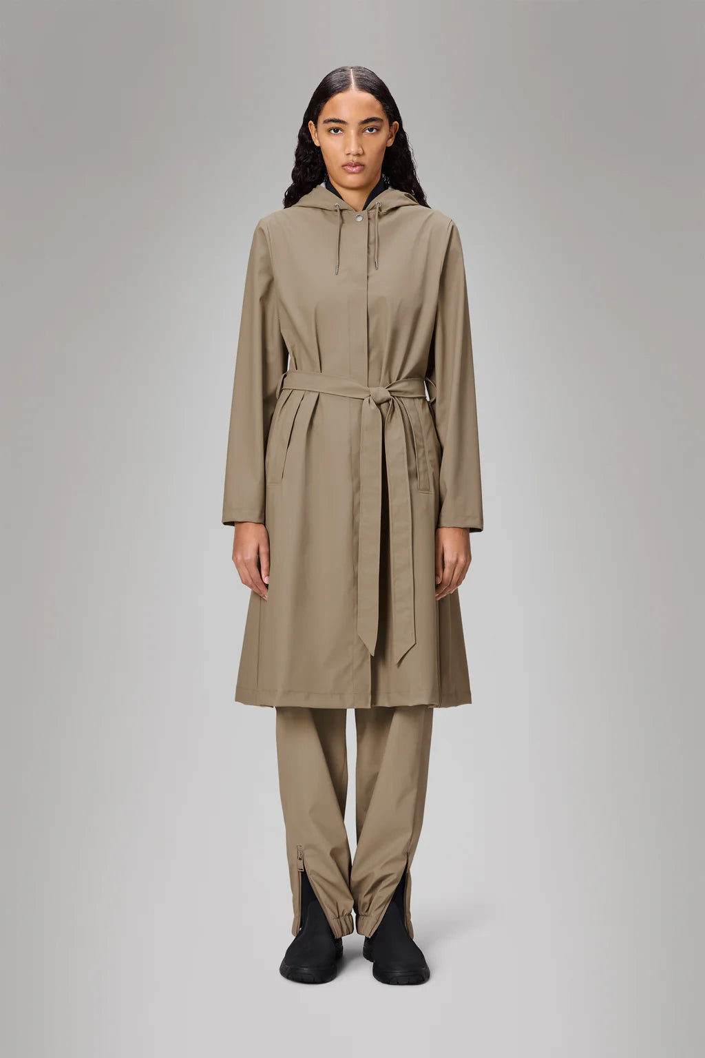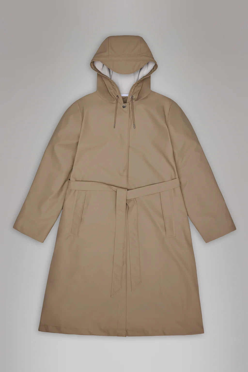 A-line Jacket Longer fra Rains er en elegant og feminin regnjakke med en flatterende A-formet silhuett og et knytebelte i livet som fremhever midjen. Den har en forlengende passform som gir ekstra dekning, og kombinerer funksjonalitet med stil.