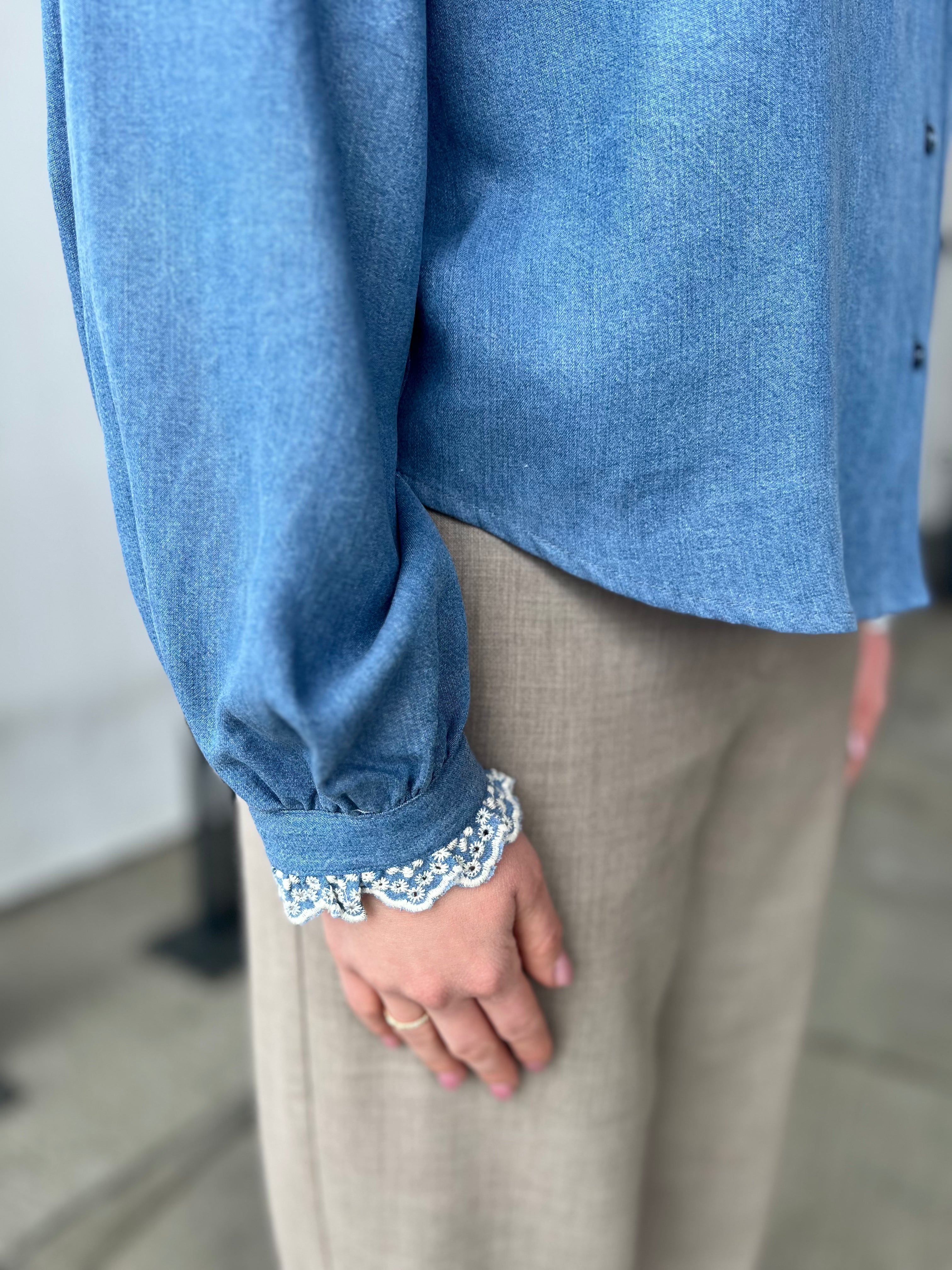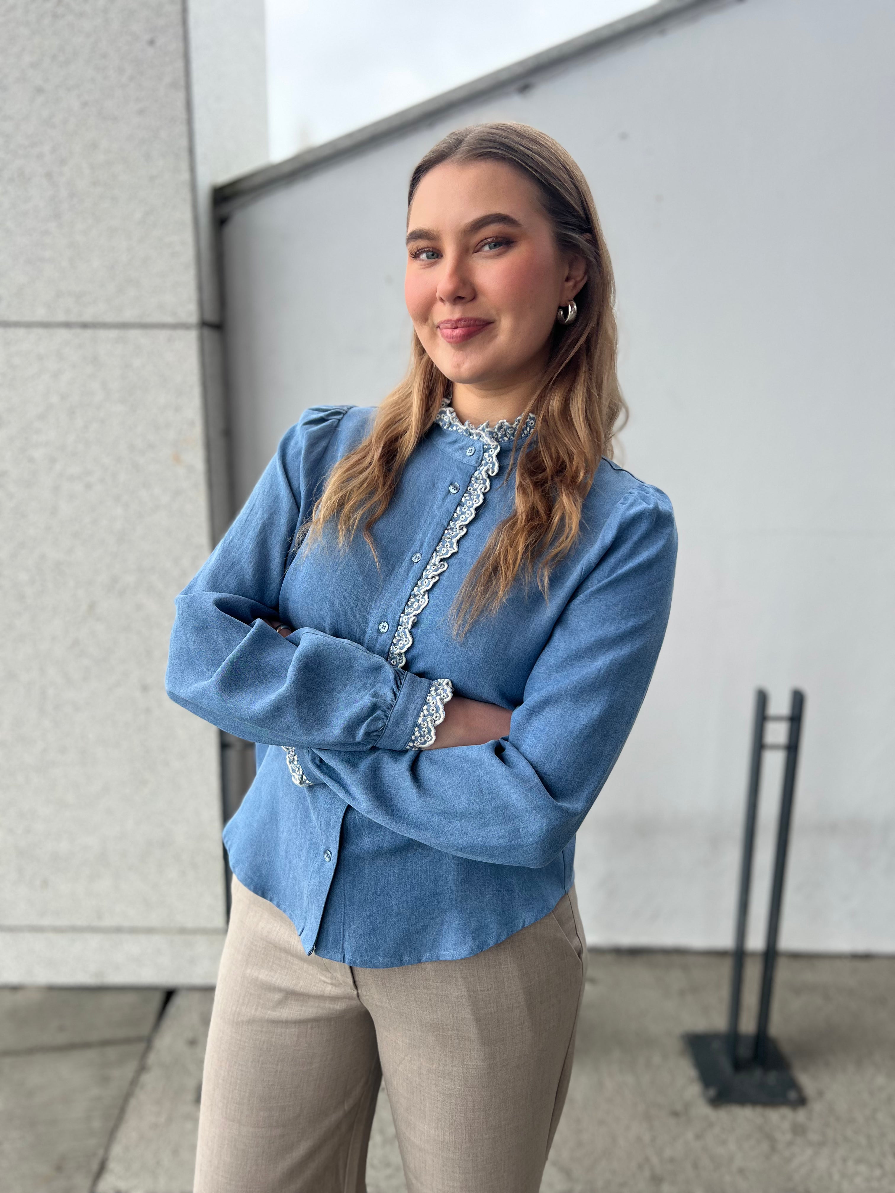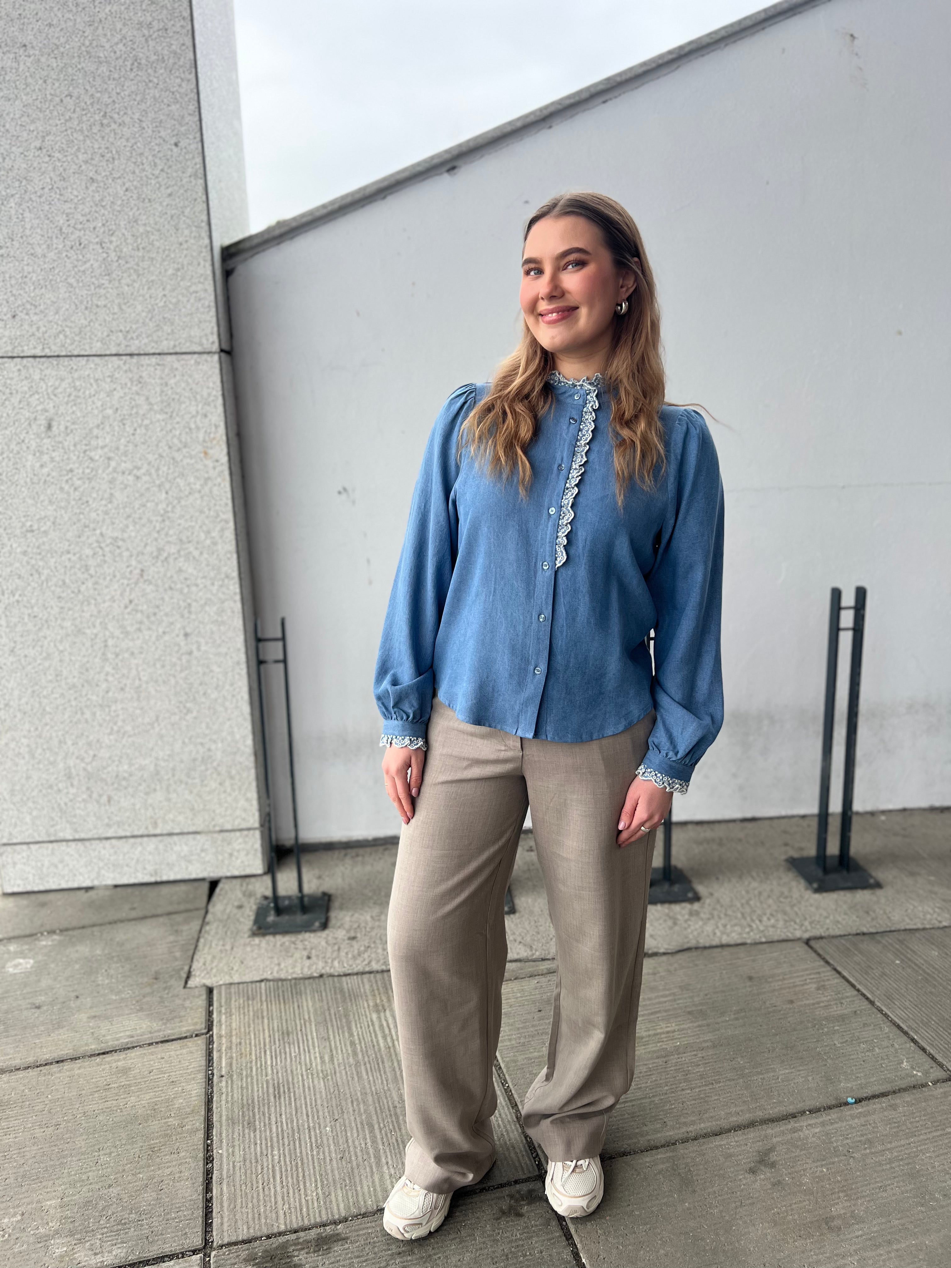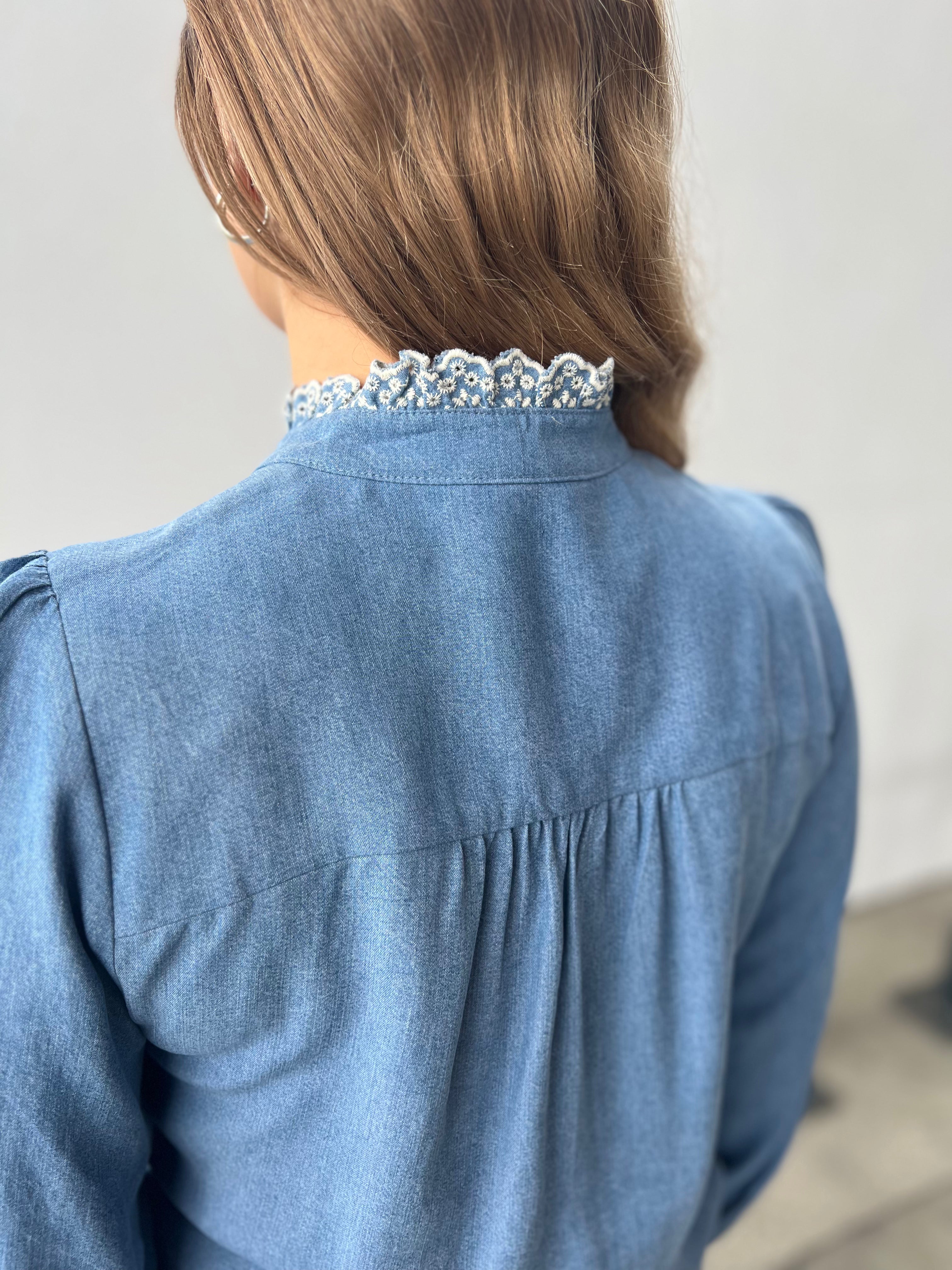 Pernilla Shirt fra Raus er laget av myk denim-tencel. Skjorten har en klassisk krage, lange ermer med mansjetter, rett passform og knappelukking i front. Med sin behagelige kvalitet i 100% tencel har skjorten en delikat og stilfulle rysjer rundt hals og ned til brystet, samt rundt mansjett som gir et feminimt preg. Blusen er normal i størrelsen.