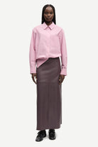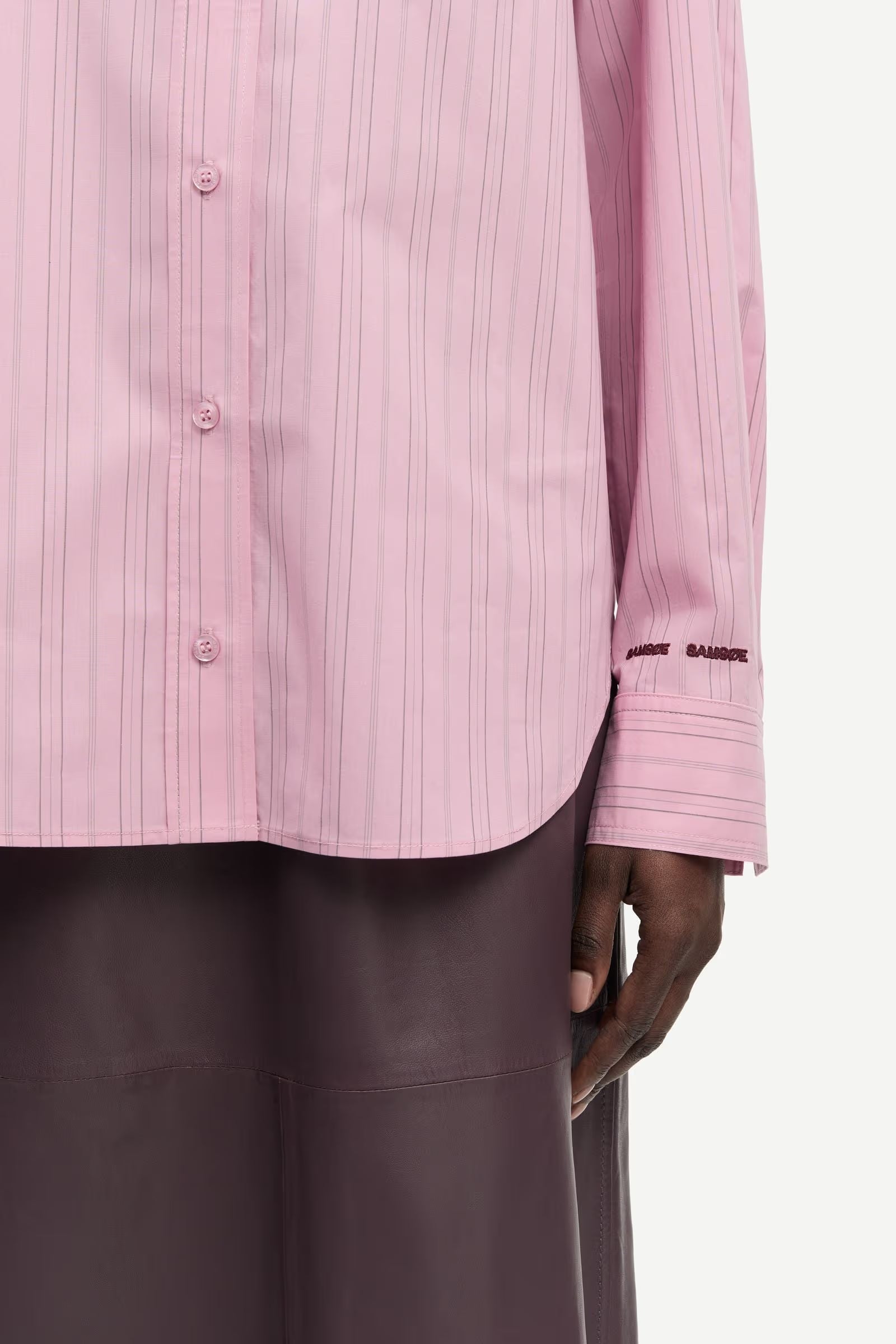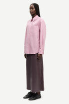 angermet skjorte med løs passform og lave skuldre. Knappelukking foran og mansjetter med knapper. Enkel påsydd lomme på brystet. Søm med legg i nakken. Brodert Samsøe Samsøe-logo på ermet. Hovedmateriale laget av 100 % økologisk bomull.