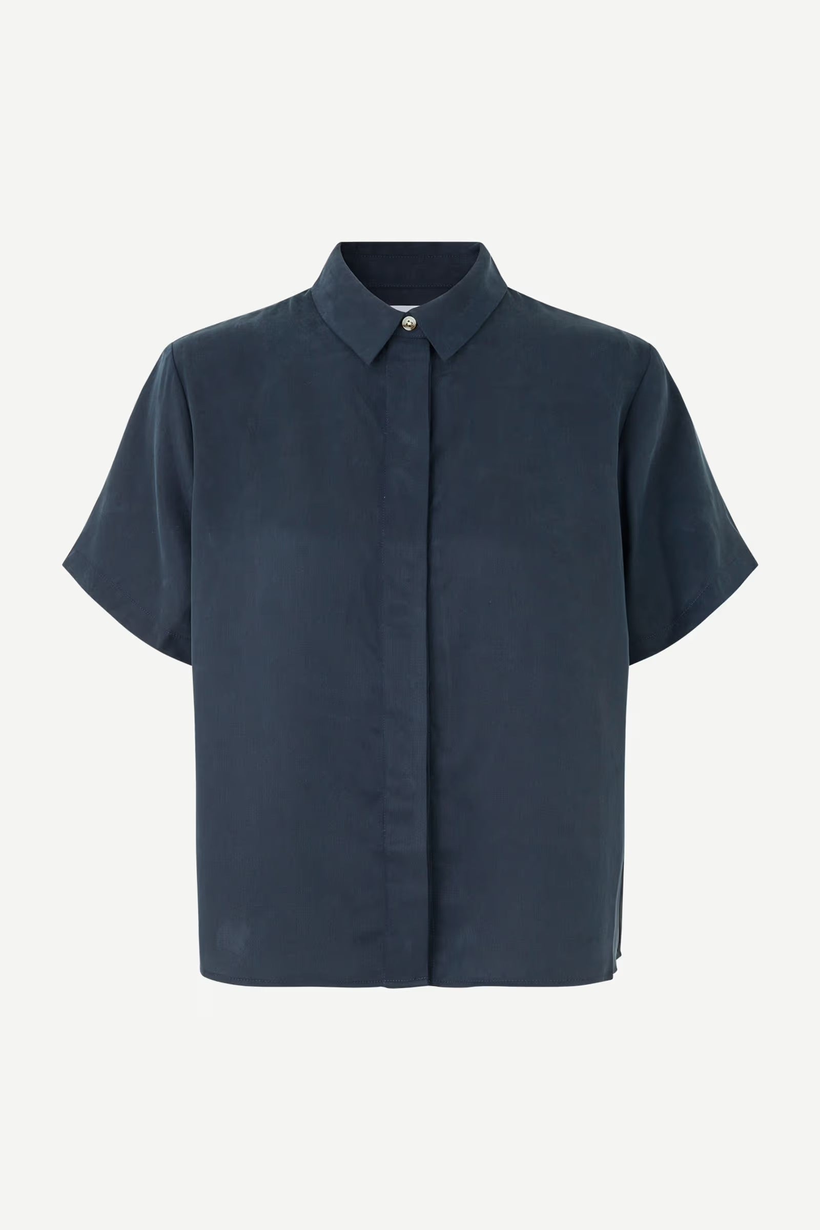 Mina SS Shirt fra Samsøe Samsøe er en lett og komfortabel skjorte med en avslappet passform og lav skuldersøm som gir et moderne uttrykk. Den har en usynlig knappelukking foran og en elegant nakkesøm med plisserte detaljer. Laget av 100 % TENCEL™ Lyocell, et miljøvennlig materiale fremstilt av ansvarlig forvaltede trekilder, kombinerer denne skjorten bærekraft med stil. Perfekt både til hverdagsbruk og avslappede anledninger.