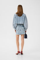 enimskjørt fra Gestuz med høy midje og rett silhuett. Klassisk femlommersdesign, frontslits og rå kant. Minilengde med diskret slitasje for et moderne preg.