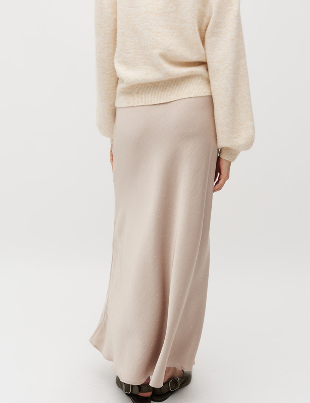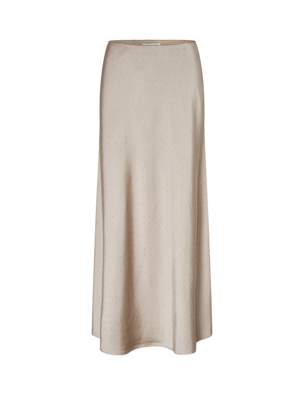 Maila-M, Maulia, Skirt Light Sand er et langt satengskjørt i lys beige med små delikate stener.