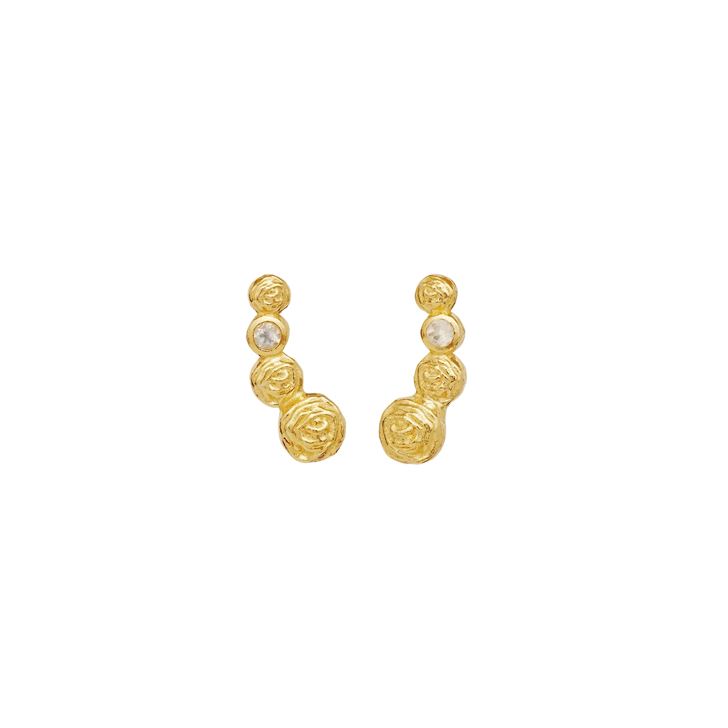 Diantha Earrings fra Maanestend har rosemotiv. Sammen med en enkel månestein kryper Diantha-øredobbene langs øret og symboliserer evig blomstrende kjærlighet og lidenskap.