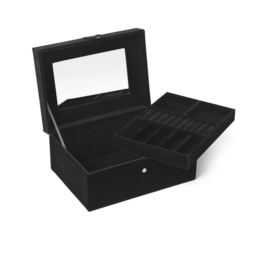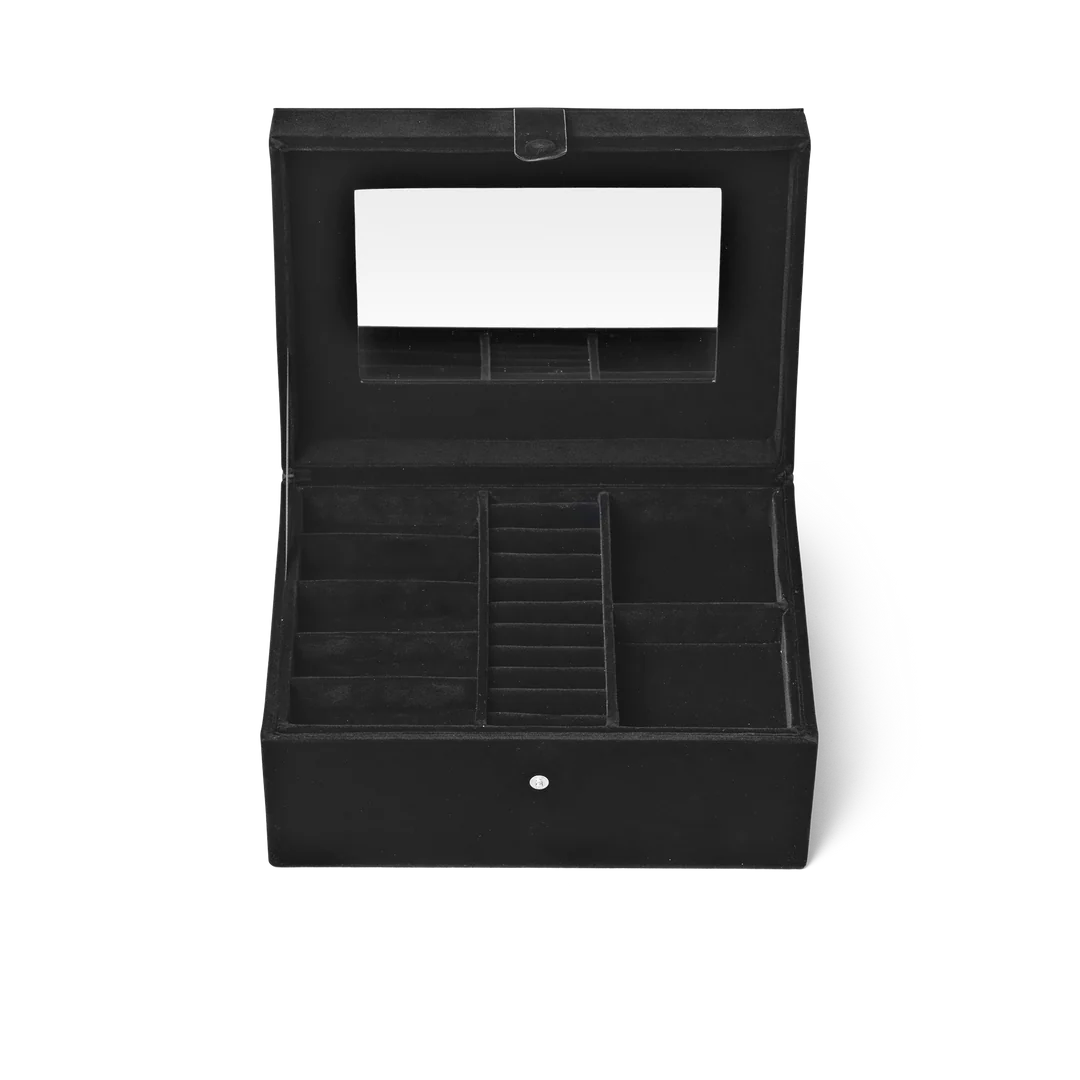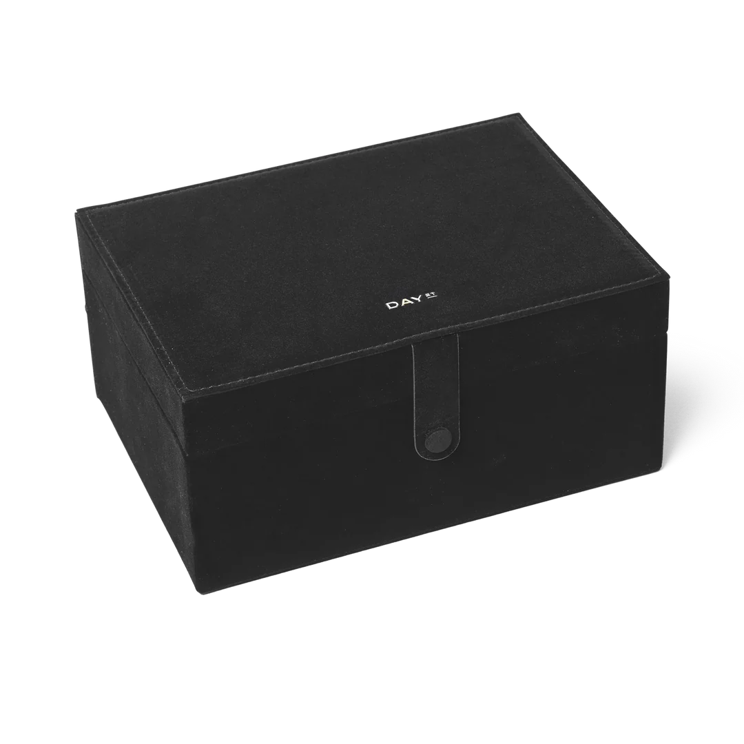 Dette stilfulle smykkeskrinet i fløyel er ideelt for å oppbevare dine fineste smykker, enten du ønsker å ha det hjemme som en dekorativ del av interiøret, eller som en elegant reisefølge. Smykkeskrinet er laget av lett, mykt materiale og har en sesongbasert fløyelsfinish med vattert effekt for ekstra luksus. Den firkantede formen gir god plass, og DAY ET-logoen i gulldetaljer gir en sofistikert touch som passer enhver stil.