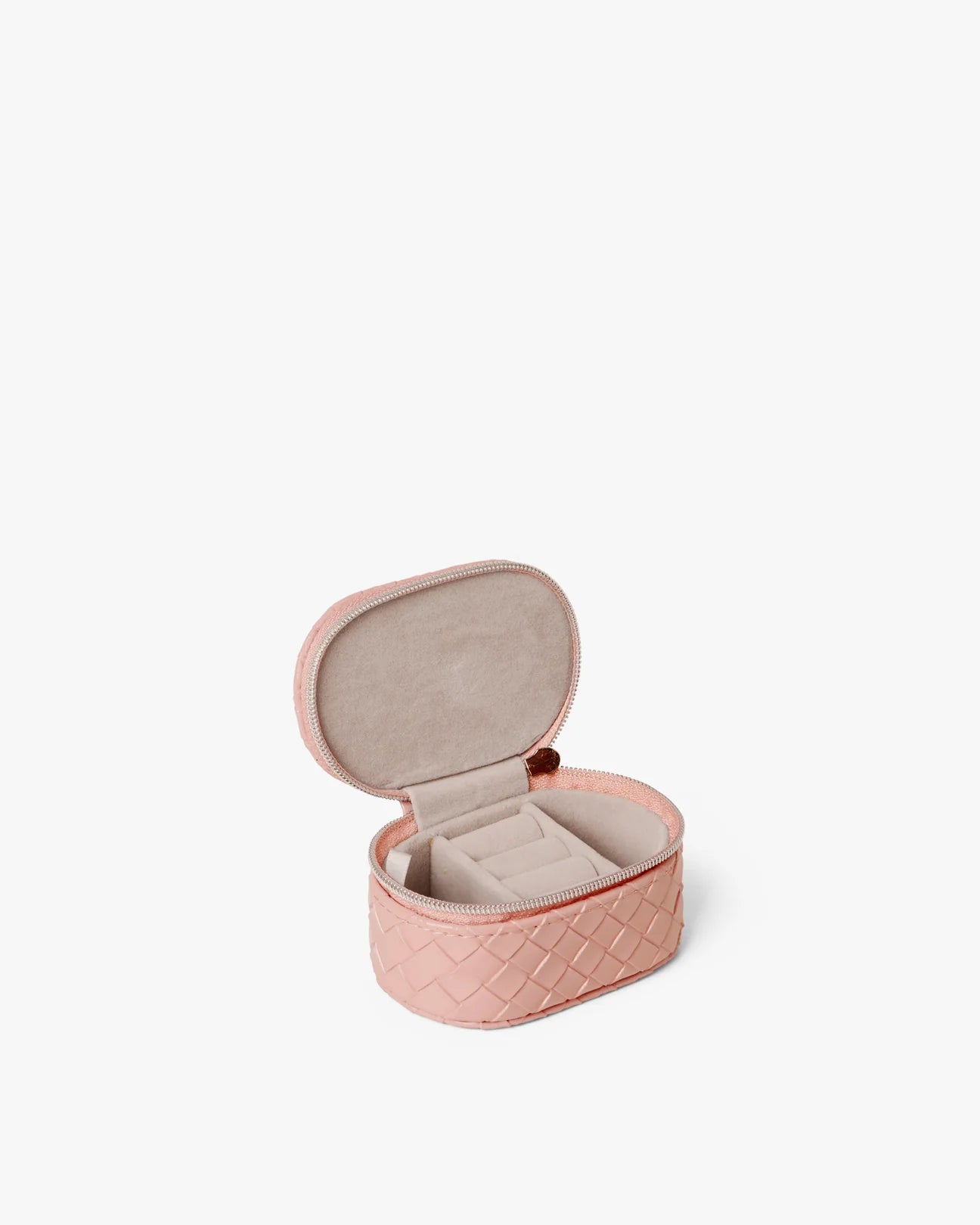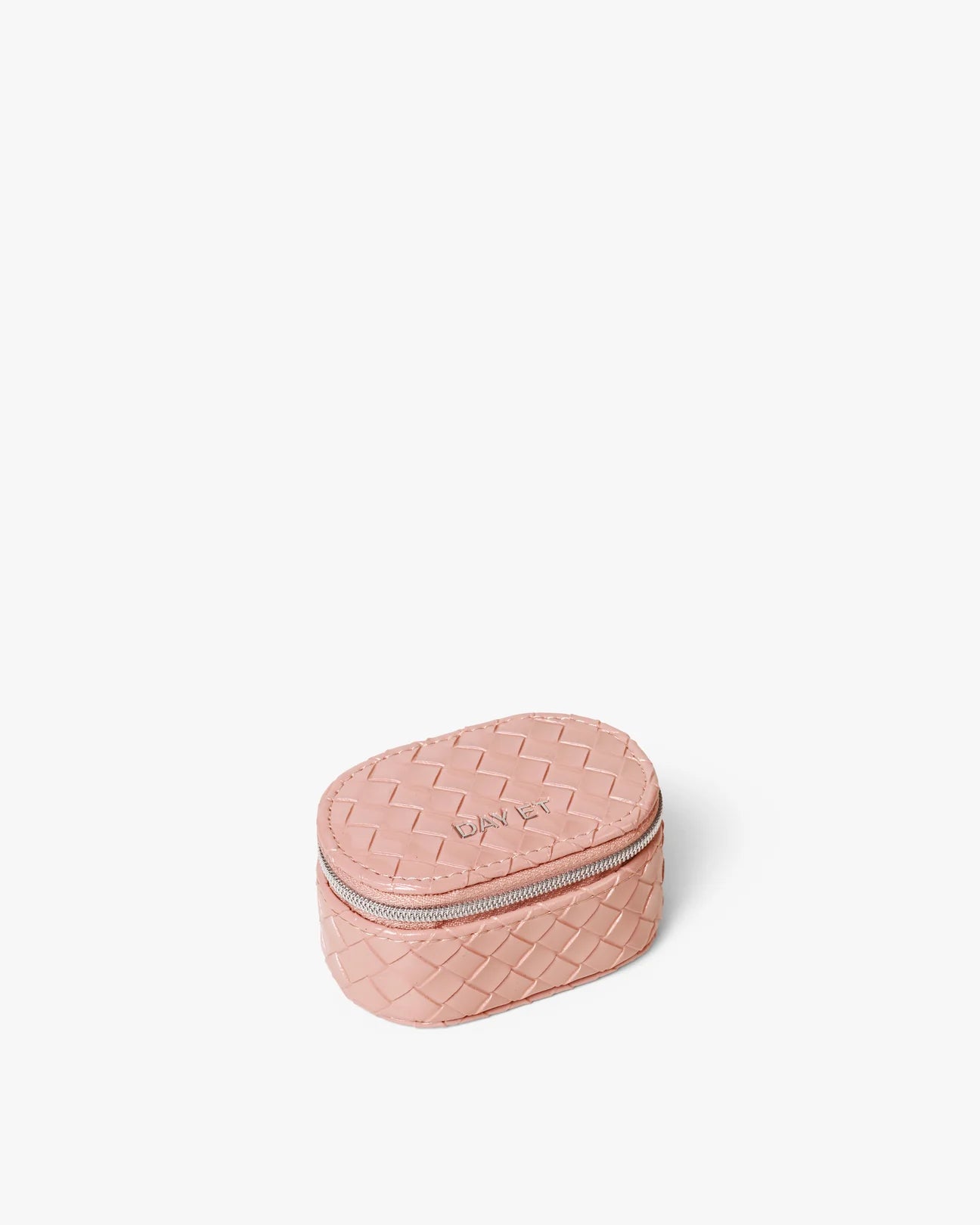 Day Braid Jewelry Zip Oval Micro Cloud Rose er et smykkeskrin designet i et flettet materiale og har Day Et-logoen i sølv på forsiden. Det lukkes med glidelås, og innvendig har det små rom der du kan oppbevare smykkene dine. Den lille størrelsen gjør det enkelt å bære smykkeskrinet i en større veske.