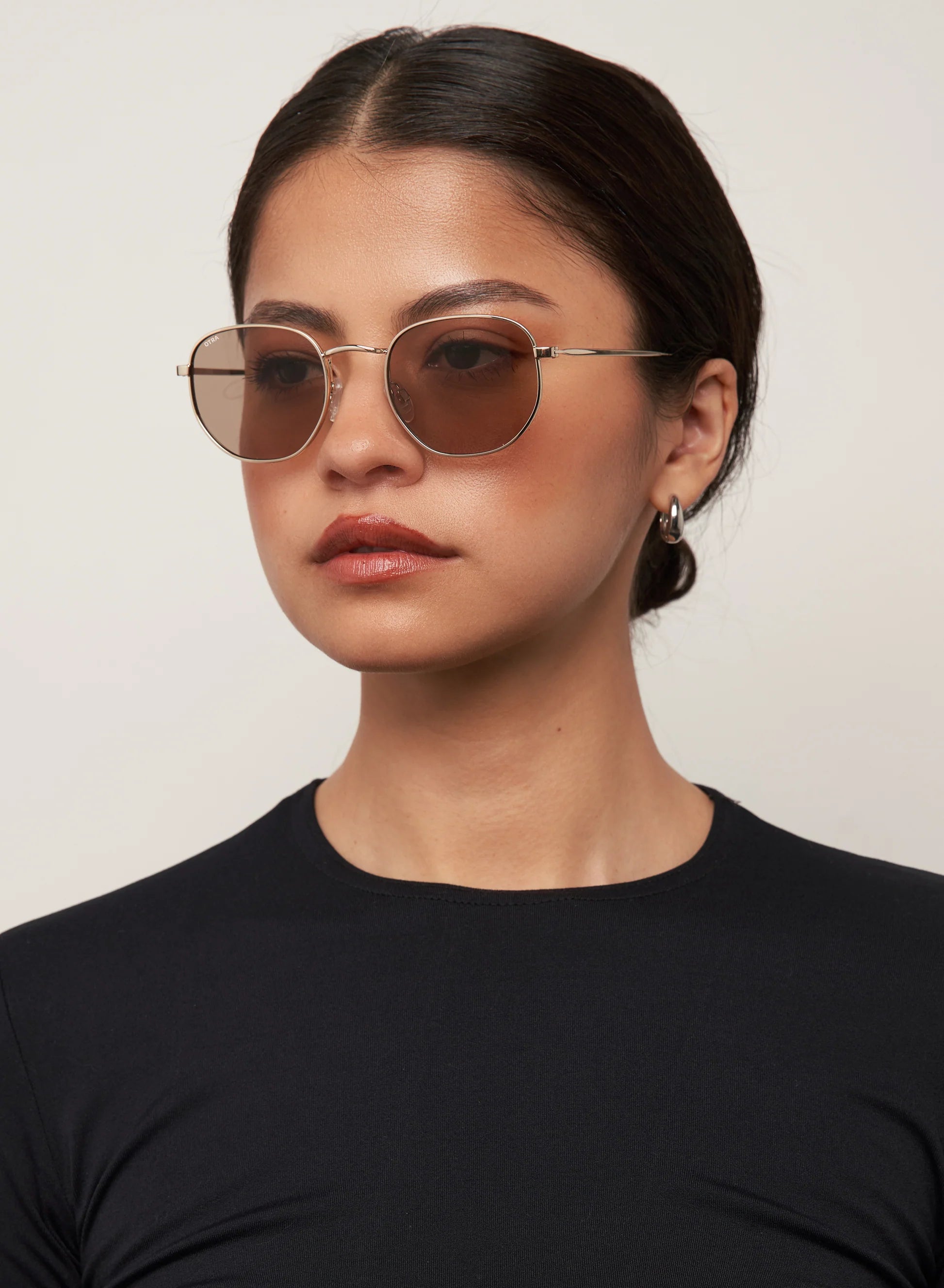 Bowie fra Otra er en elegant solbrille med sekskantet metallinnfatning i gull, en perfekt kombinasjon av vintage sjarm og moderne eleganse. De varme brune glassene gir et tidløst uttrykk og en raffinert look som passer til enhver anledning. Brillene har rundet form, linsekategori 2 og gir 100 % UV-beskyttelse. Leveres med et beskyttende etui i vegansk materiale.