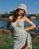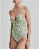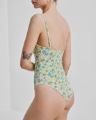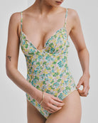 Balconette Swimsuit fra byTiMo er en flatterende badedrakt fra byTiMo med et vakkert grønt blomsterprint. Balconette Swimsuit har dyp utringning og tynne, justerbare stropper over skuldrene som kan festes på ulike måter. Den er kuttet i byTiMos GRS sertifiserte kvalitet og har behagelig stretch. Denne badedrakten er perfekt til stranden eller å bruke som topp sammen med shorts eller skjørt.