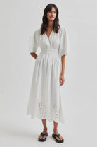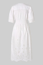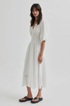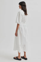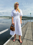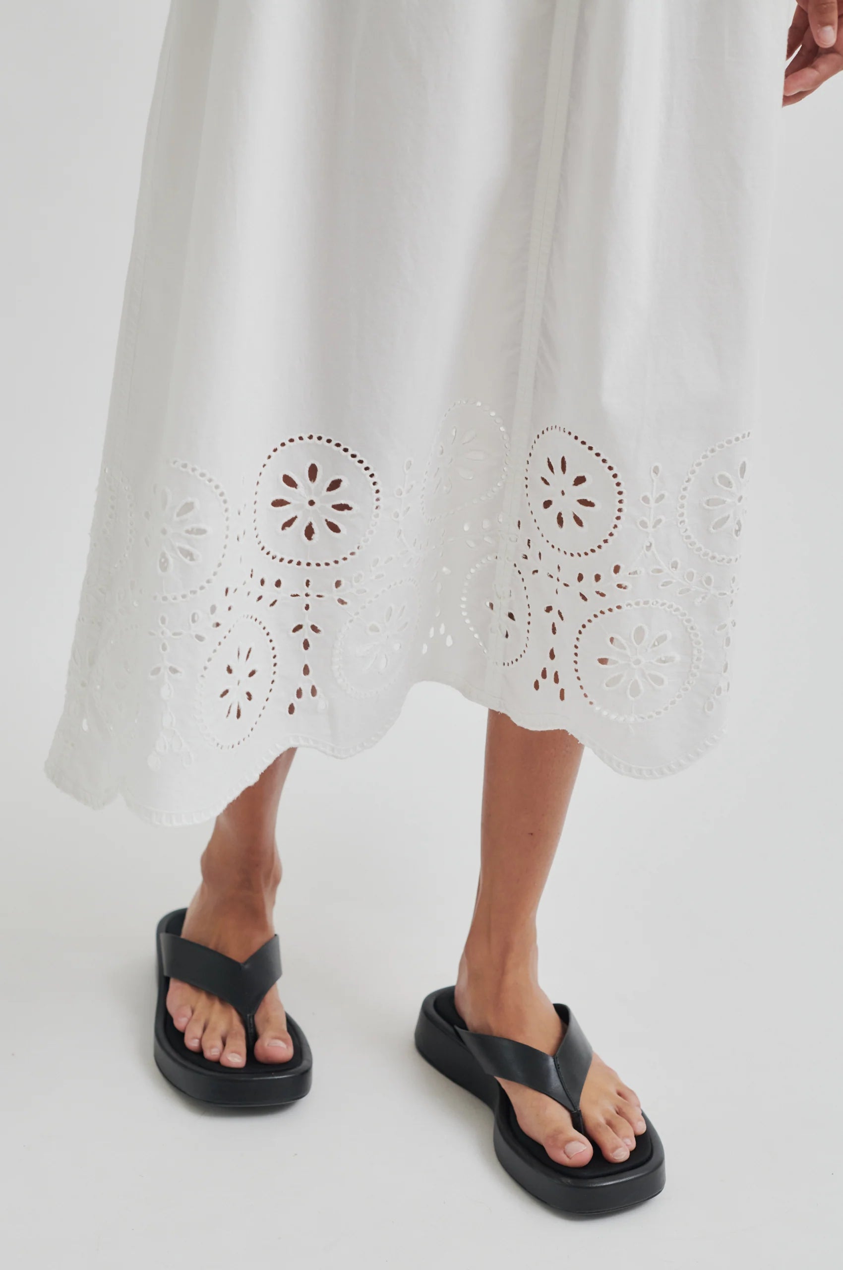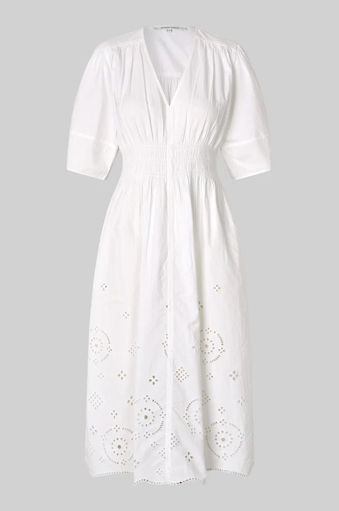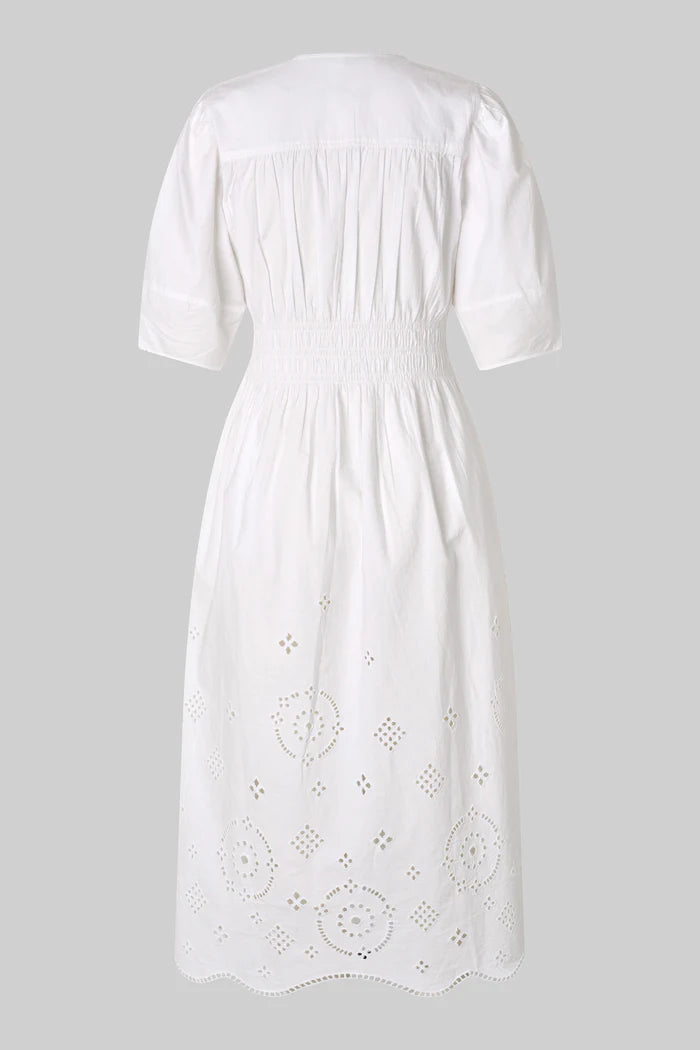 Althea Dress er en kjole i broderie anglaise fra Second Female. Kjolen er laget i myk og lett bomull med vakre broderie anglaise-detaljer langs kanten på skjørtet. Den har en feminin V-hals og en elastisk, rynket midje som fremhever silhuetten. Stoffet er samlet på skuldrene og lett puffede ermer i albuelengde gir et mykt og romantisk uttrykk. Normal passform med markert midje.