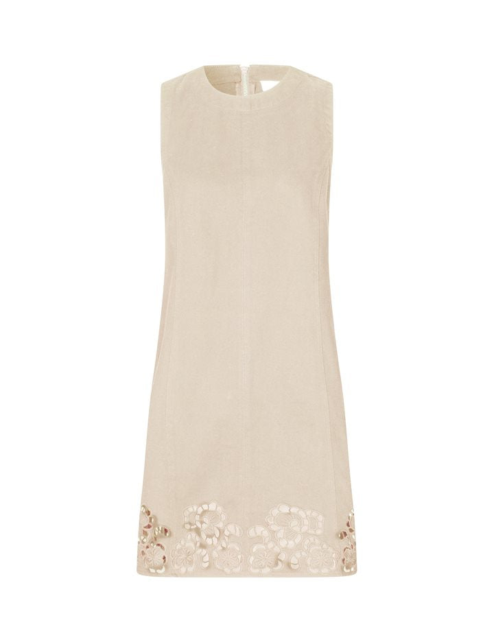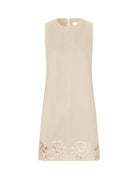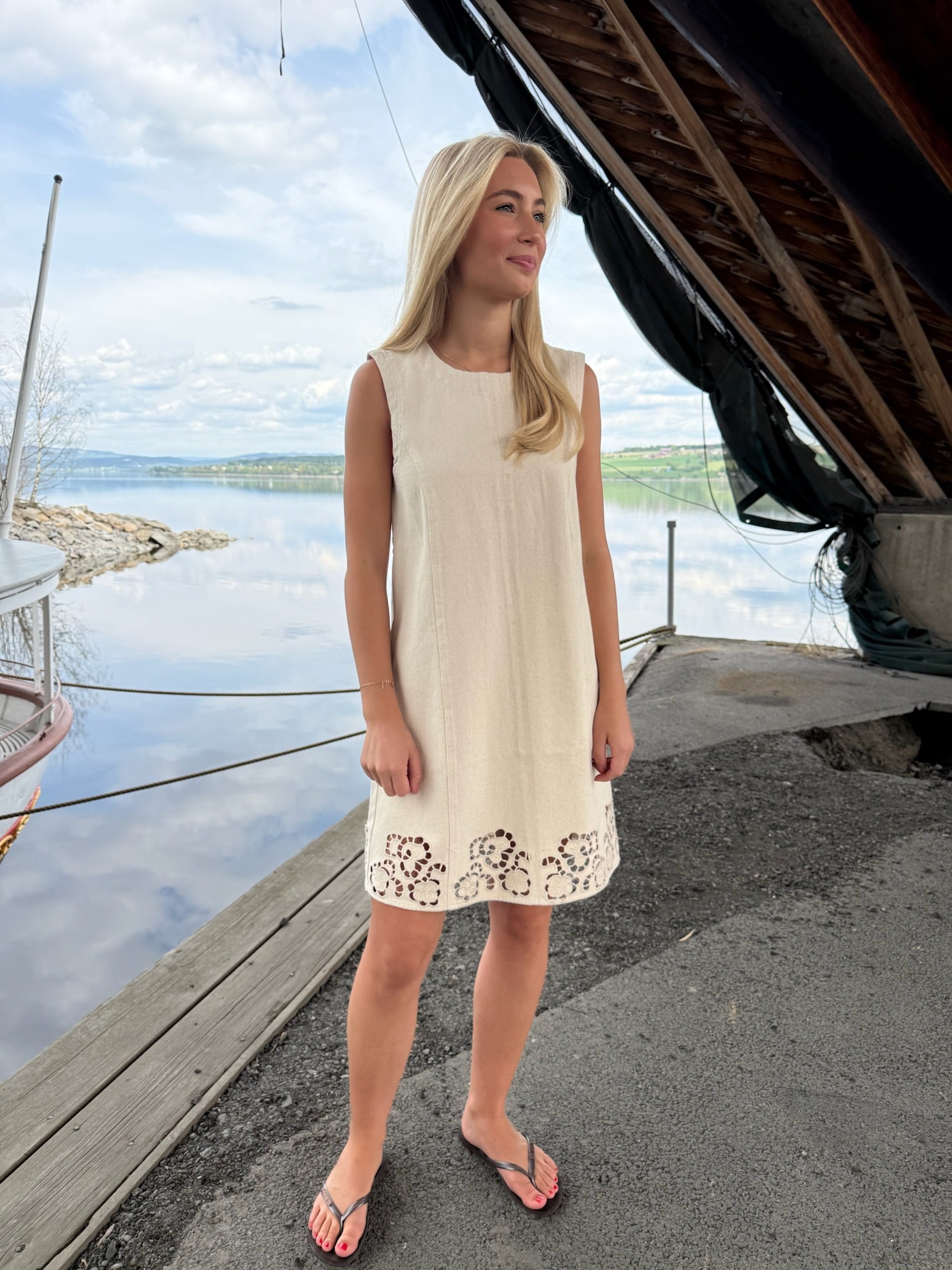 Tessia-M Juhi Lace Dress Oyster fra MbyM er en nydelig, brodert drømmekjole til våren! Denne kjolen er laget i 100 % bomull og har en løs passform i midi-lengde med rund hals og diskré glidelås i ryggen. Det vakre broderiet nederst på skjørtet gir et romantisk og sofistikert uttrykk, perfekt til både hverdag og festlige anledninger.