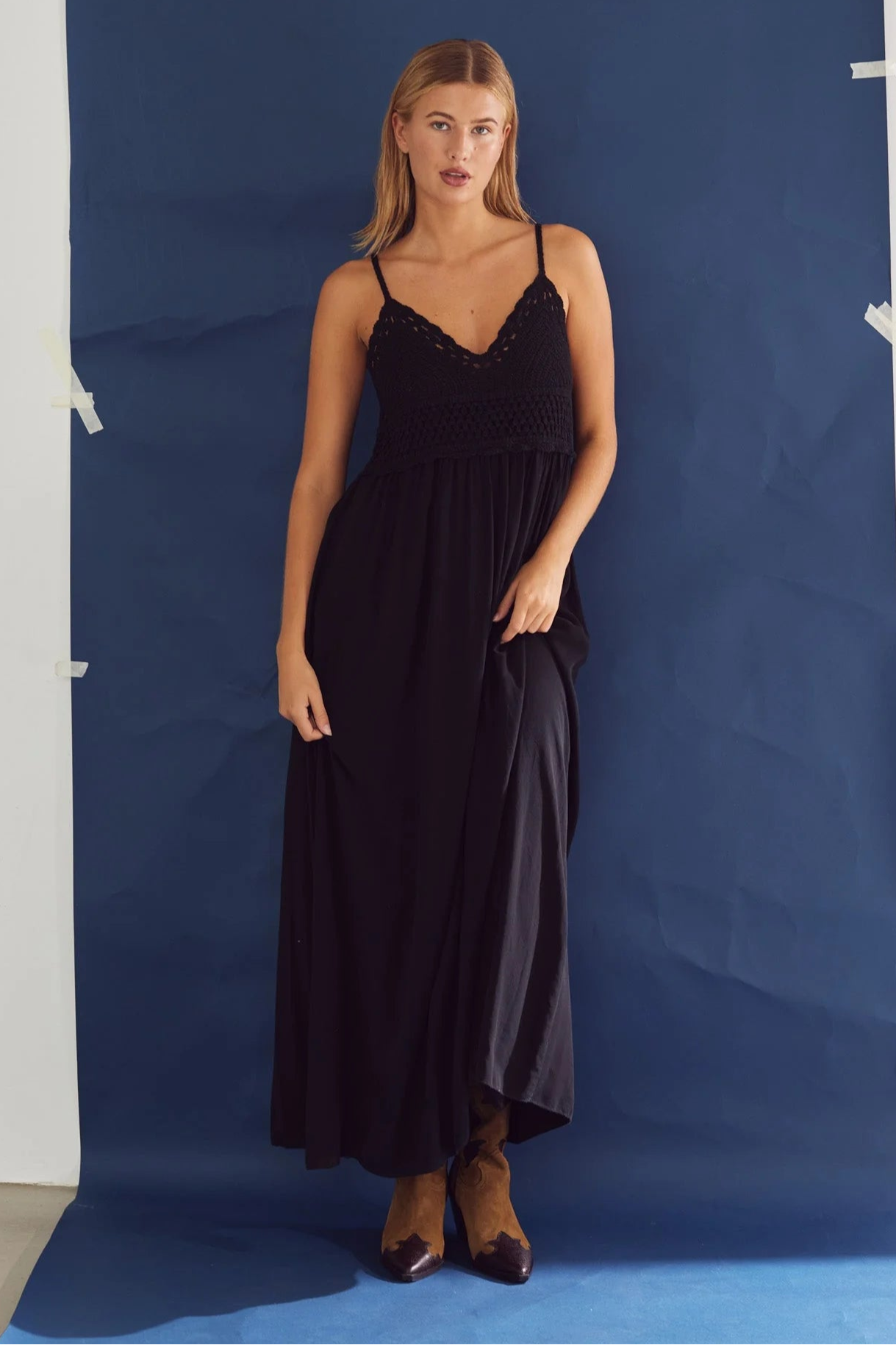Lylan Dress Black fra Noella er en maxikjole med strikket overdel. Kjolen er perfekt til varme sommerdager, eller stylet med en god oversized genser til kjølige kvelder.