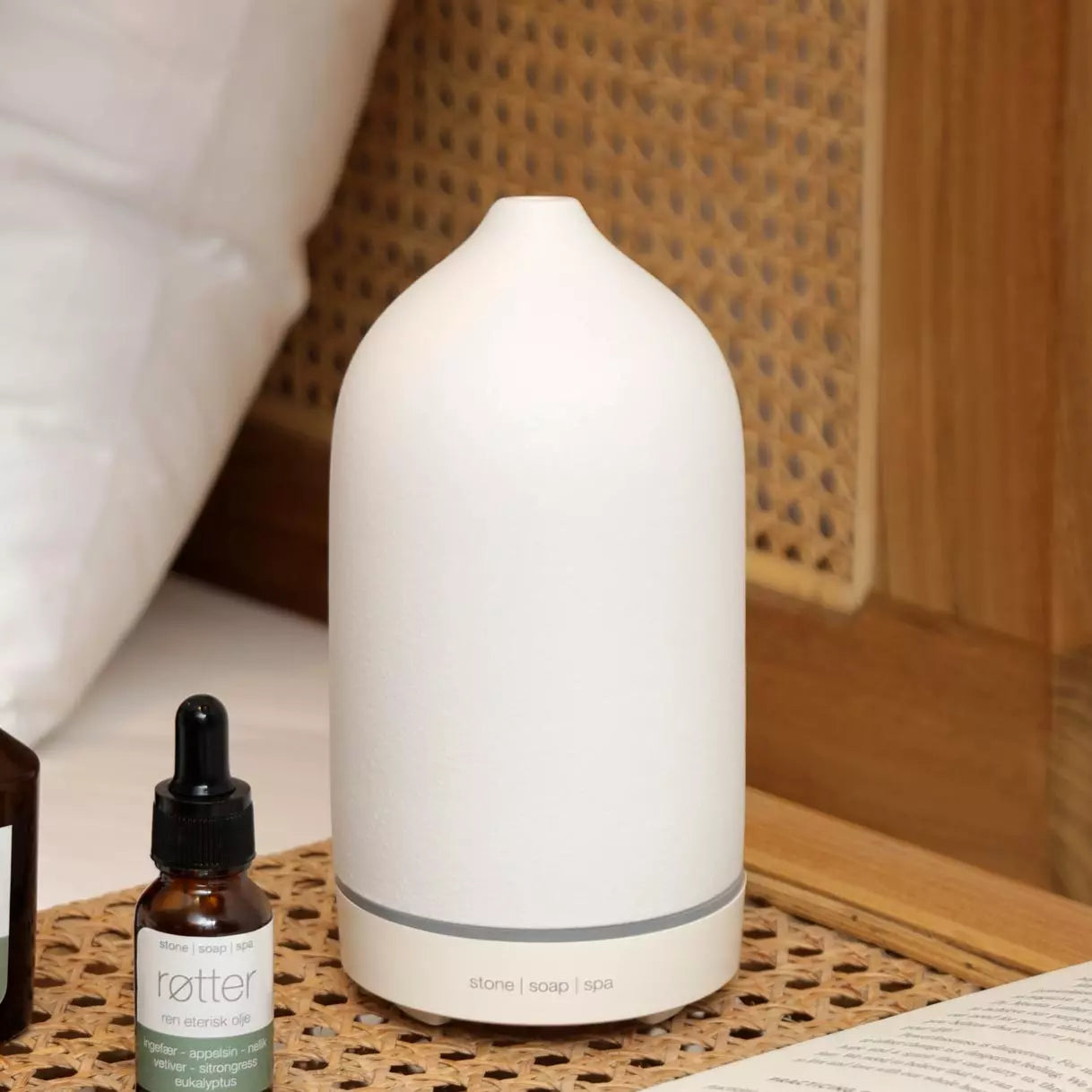 Med Aroma Diffuser fra Stone Soap Spa kan du skape en deilig duft og atmosfære i hjemmet ditt på en naturlig og mer forfriskende måte enn duftlys eller duftpinner. Denne elektriske duftsprederen i keramikk og høy teknisk kvalitet, gjør vann om til damp og sprer en behagelig, velduftende aroma i rommet. Alt du trenger å gjøre er å tilsette 15-20 dråper eteriske oljer i vannet, og la diffuseren gjøre jobben.