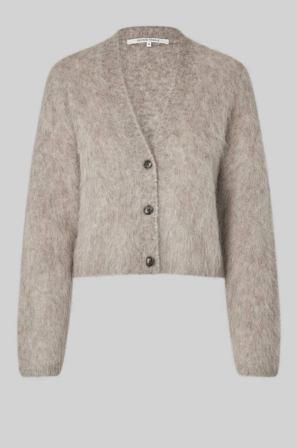 Karla Knit Cardigan Pumice Stone fra Second Female er en myk og fluffy cardigan laget i en luksuriøs alpakkablanding. Den har V-hals, lange ermer og knappelukking foran. Passformen er vanlig med et lett boksy snitt som gir et avslappet, men elegant uttrykk.