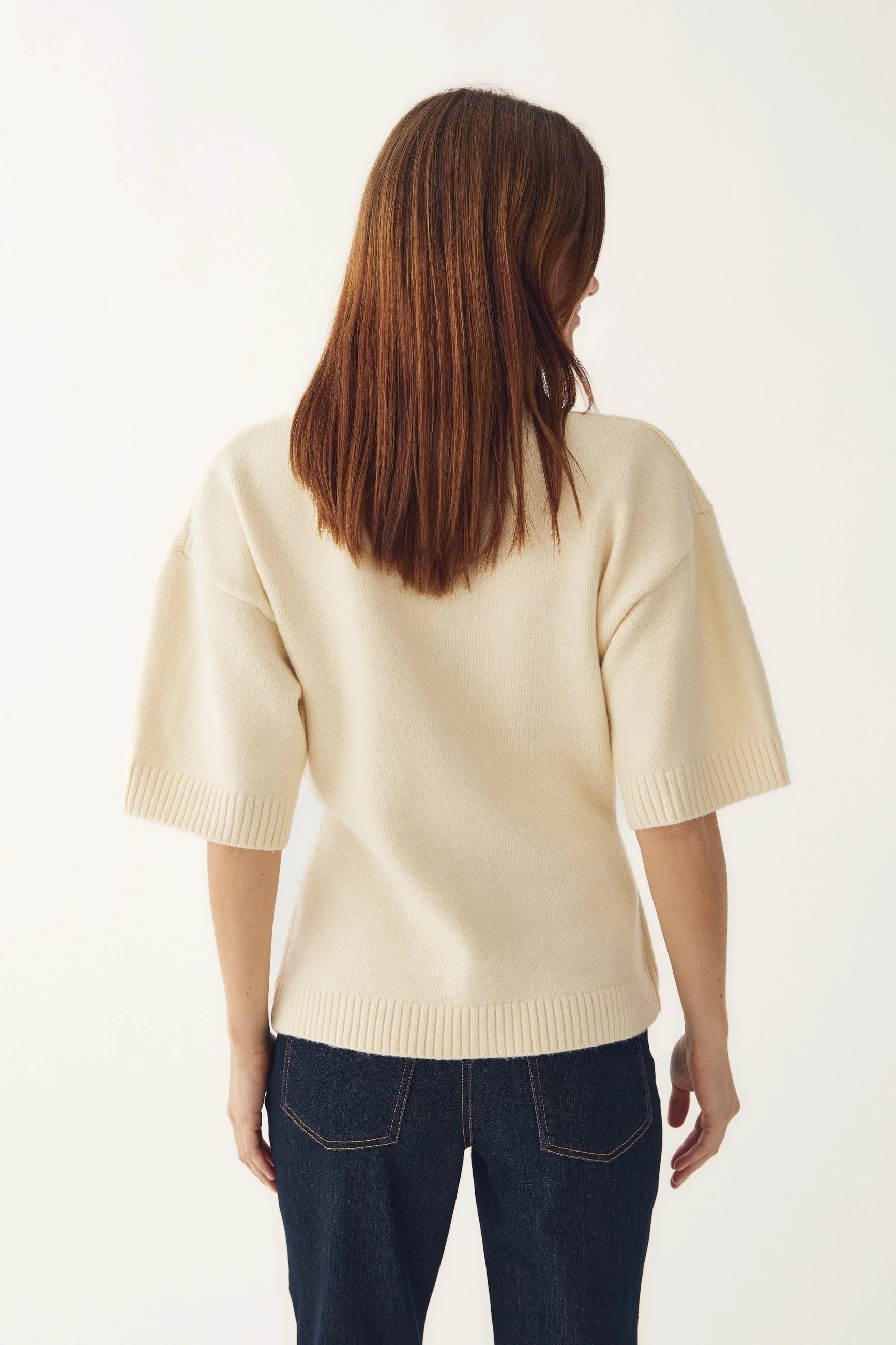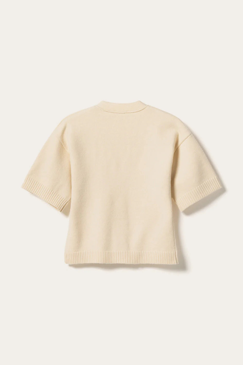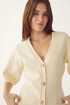 N-Lenyx SS Knit fra Noella er en tettsittende, kortermet strikkekardigan med V-hals. Den har store knapper og ribbekanter nederst og på ermene.