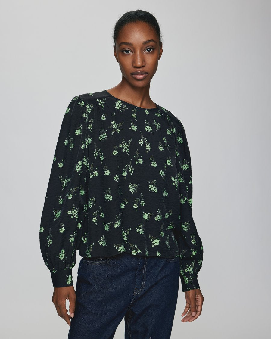 Jusine Karalynn Top fra MSCH Copenhagen har en rund hals, lange ermer med mansjetter og en liten puff ved skuldrene.