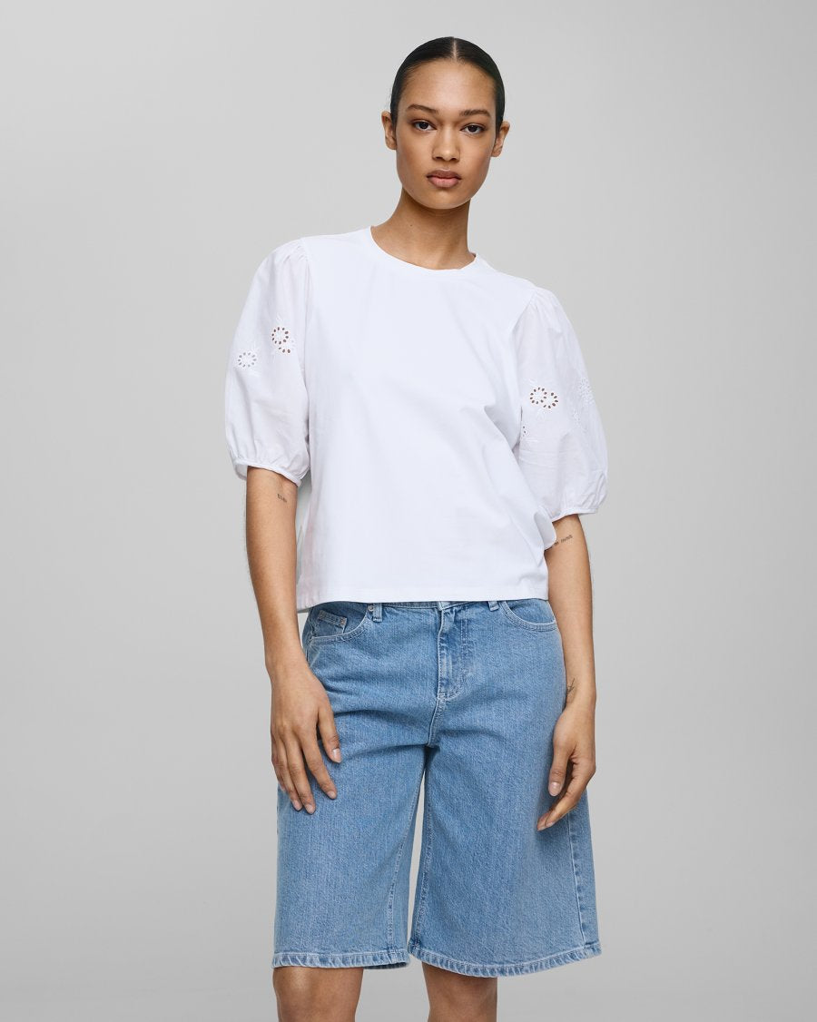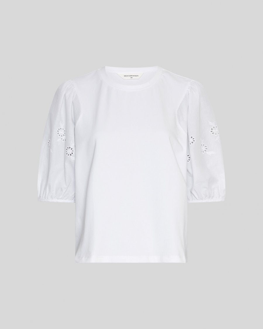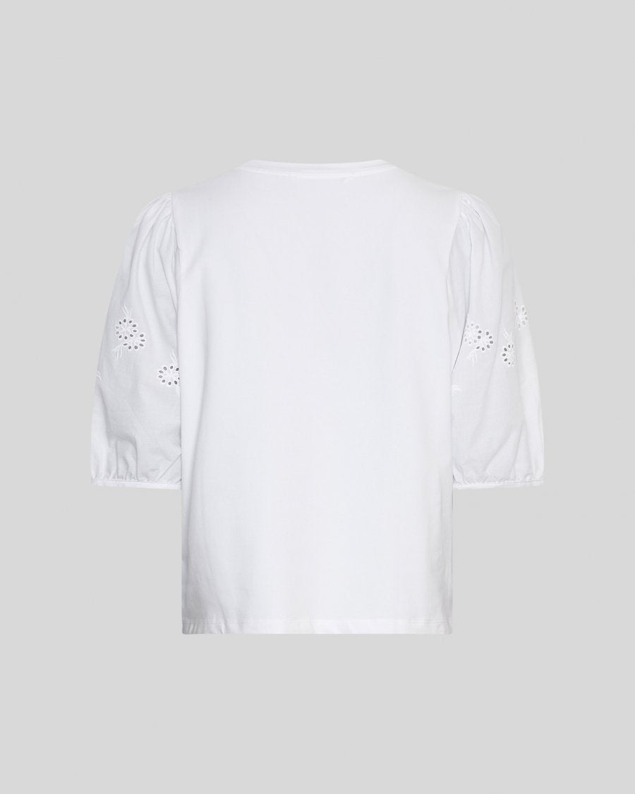 MSCHCebrina 2/4 Top fra MSCH Copenhagen er en jerseytopp med rund hals og 2/4-ermer som har et blomsterbroderidetalj. Den er perfekt som en hverdagstopp!