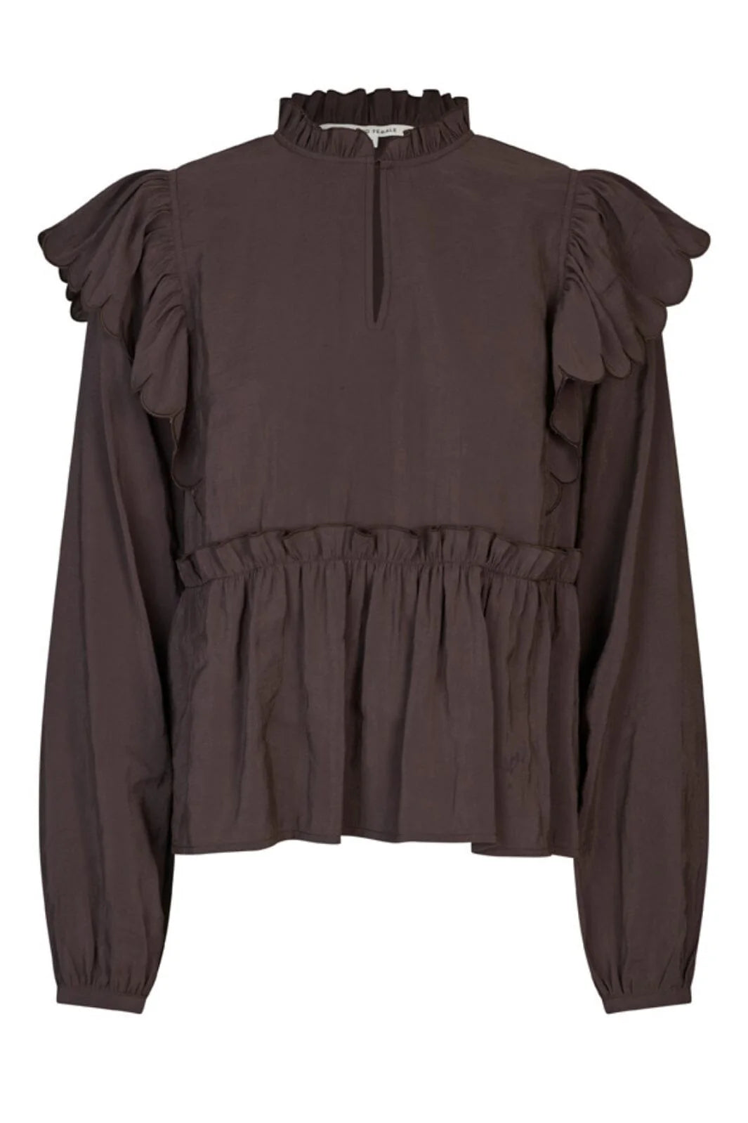 Terra Frill Blouse Chocolate Plum er en feminin bluse fra Second Female laget i en myk og lett modalblanding som faller vakkert. Overdelen har rund hals med volangkant og nøkkelhullsåpning med knappelukking bak. Skuldrene er pyntet med overlappende volangdetaljer, og de lange ermene avsluttes med mansjetter med knapper. Den volangkantede nederdelen gir et romantisk preg, mens den avslappede passformen gir et luftig og behagelig uttrykk.
