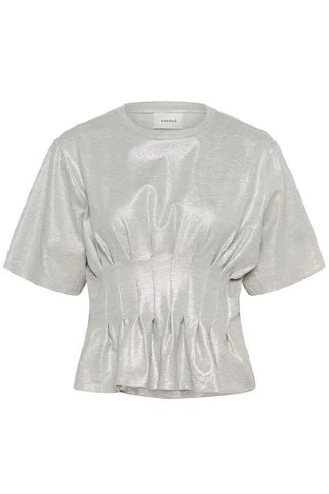 GZPamila Tee Silver Glitter fra Gestuz er en moderne t-skjorte med en metallisk finish som gir et sofistikert og glitrende uttrykk. Toppen har rund hals, korte ermer og en feminin peplumkant som skaper en flatterende silhuett. Denne toppen er en perfekt blanding av komfort og statement, og er enkel å style både til hverdags og fest.