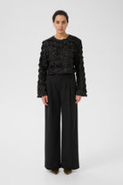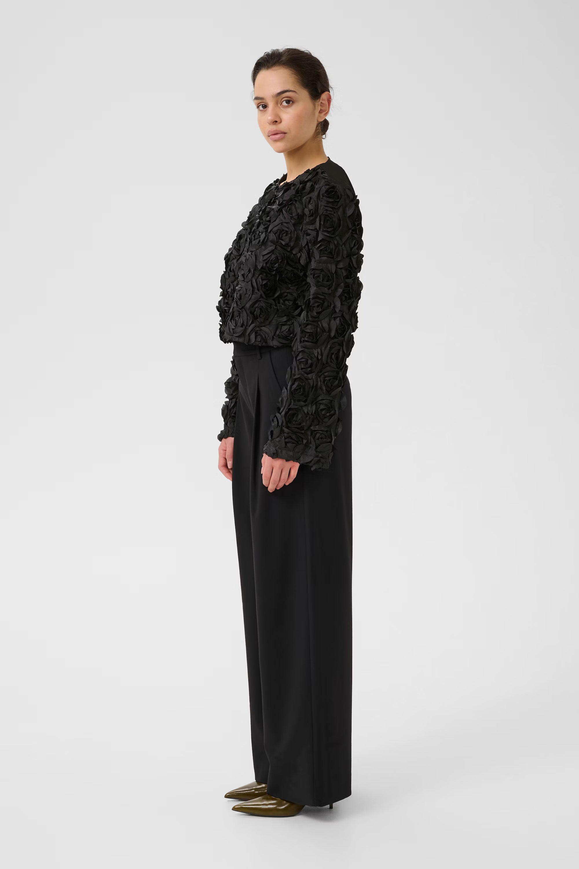 Bluse med lange ermer og 3D-blomsterapplikasjoner foran og på ermene. Rund hals, kort lengde og knappelukking i nakken gir en elegant finish.