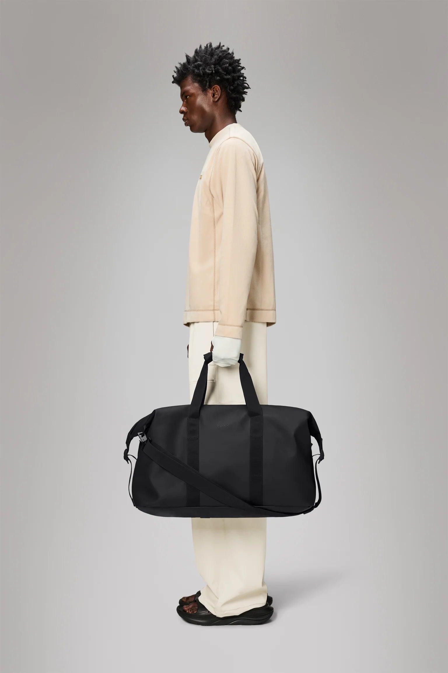 Hilo Weekend Bag er Rains sin versjon av den essensielle overnattingsbagen. Hilo Weekend Bag er en ren og moderne reisefavoritt, som balanserer Rains' vanntette stoff med signaturremmer og hardware-detaljer. Åpne den belagte glidelåsen i full lengde for å finne et romslig hovedrom – med god plass til klær, teknologi og mer for en jobbreise eller en helgetur. Når den er pakket, kan du sikre eiendelene med de sidemonterte kompresjonsremmene på silhuetten.