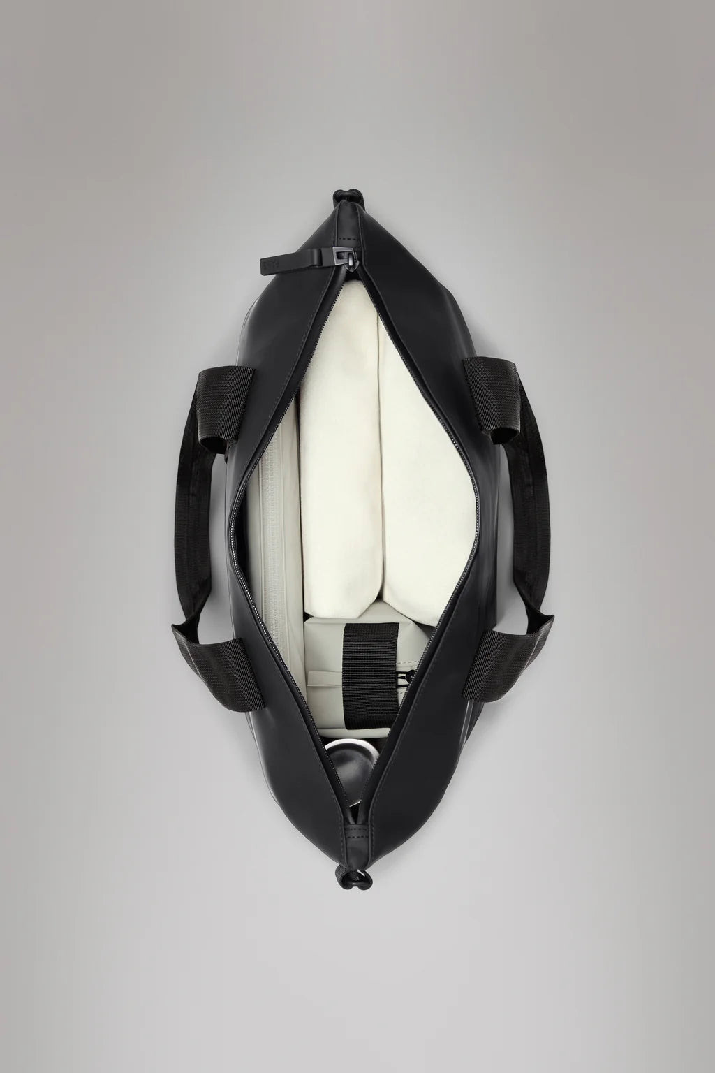 Tote Bag Mini fra Rains er en veske perfekt for shopping, pendling eller på kontoret. Vesken har et stort hovedrom som åpnes med en belagt glidelås. Vesken har en avtakbar skulderreim, lange hånd-/skulderhåndtak, og festeringer for små gjenstander som nøkler. Den er vanntett mot lett regn, med en vannsøyle på 8000 mm.